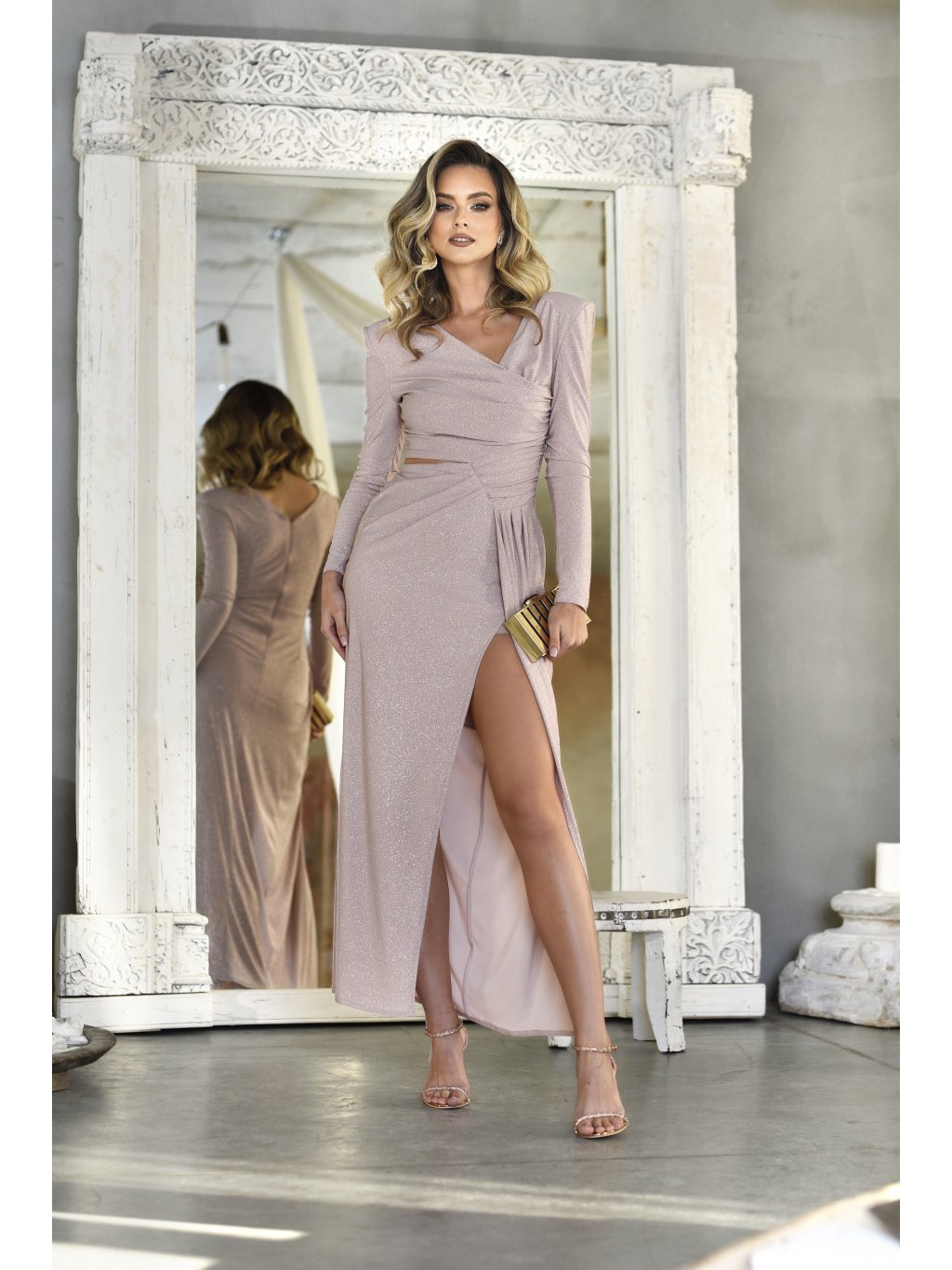 Elegantné asymetrické trblietavé dámske šaty v dĺžke po zem , ktoré lichotia ženskej siluete. Vrchná časť je riešená prekríženým V- výstrihom, ktorý opticky predlžuje krk a zvýrazňuje dekolt . Dlhé rukávy dodávajú modelu sofistikovaný charakter, vhodný aj na chladnejšie obdobie. Pod prsiami sa nachádza jemne zvýšený pás s odhaleným bokom, ktorý formuje postavu a opticky zoštíhľuje driek. Sukňa je voľná , plynulo splývavá a mierne rozšírená . Šaty sa zapínajú vzadu na zips.