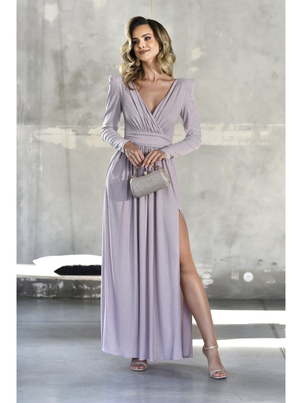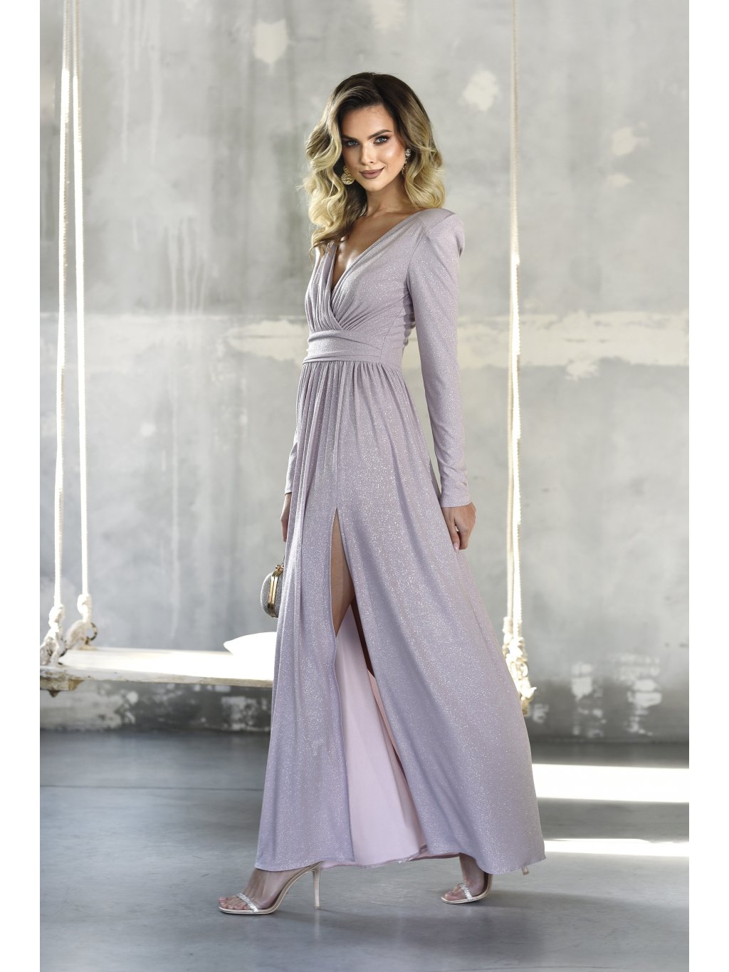 Elegantné trblietavé dámske šaty v dĺžke po zem , ktoré lichotia ženskej siluete. Vrchná časť je riešená prekríženým V- výstrihom, ktorý opticky predlžuje krk a zvýrazňuje dekolt. Dlhé rukávy dodávajú modelu sofistikovaný charakter, vhodný aj na chladnejšie obdobie. Pod prsiami sa nachádza jemne zvýšený pás , ktorý formuje postavu a opticky zoštíhľuje driek. Sukňa je voľná , plynulo splývavá a mierne rozšírená . Šaty sa zapínajú vzadu na zips.