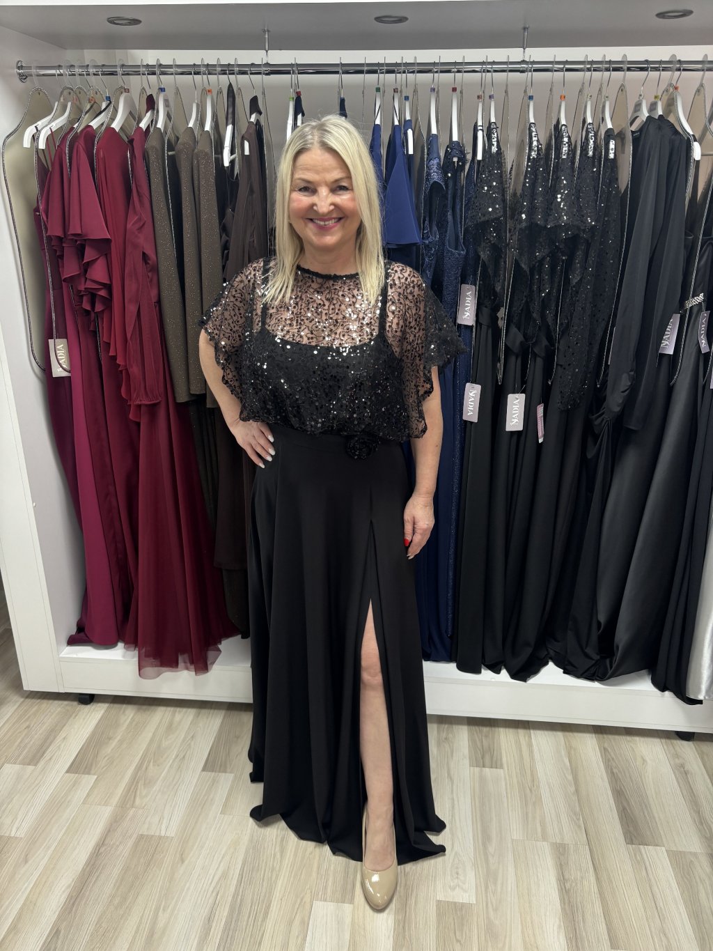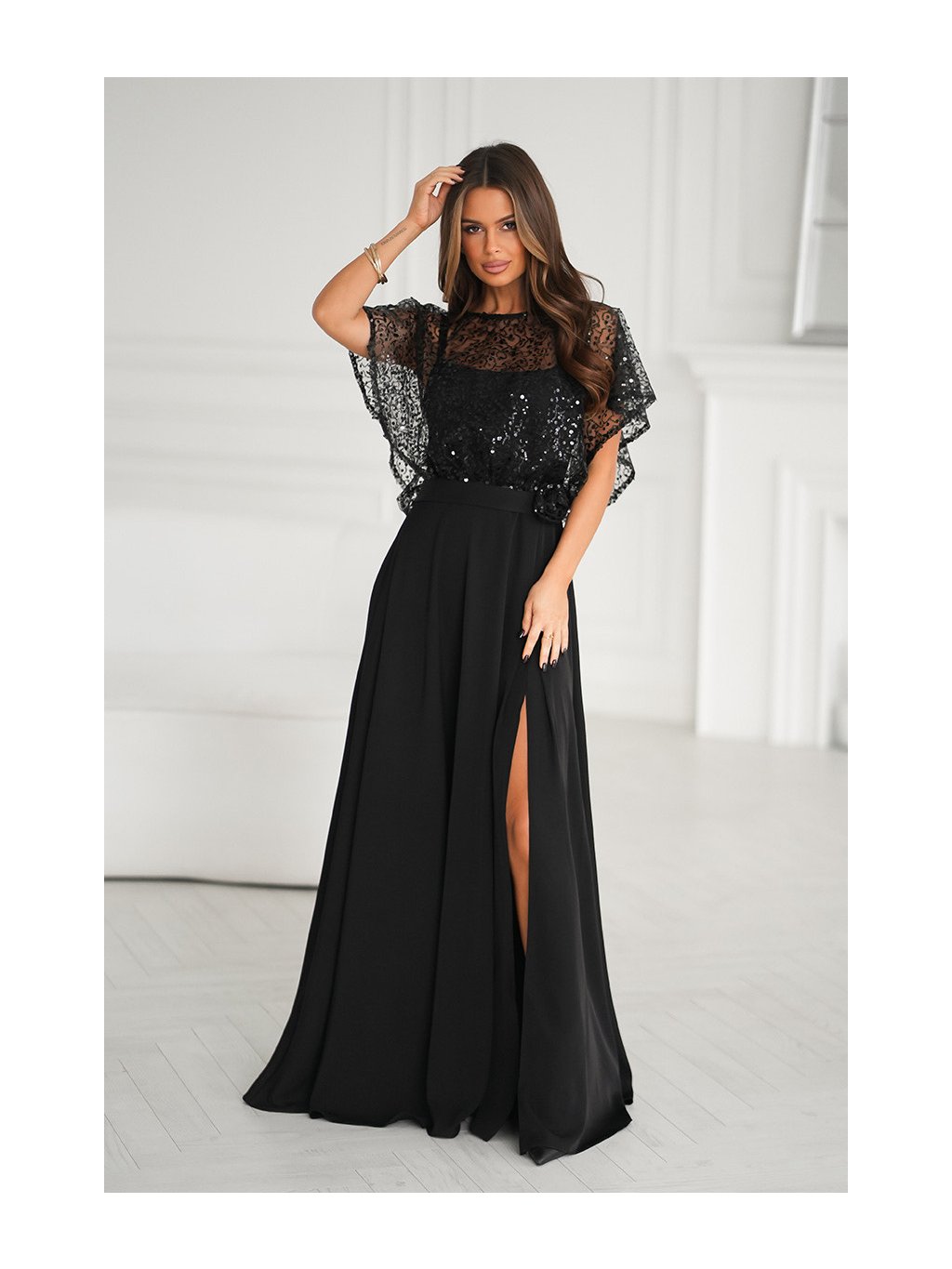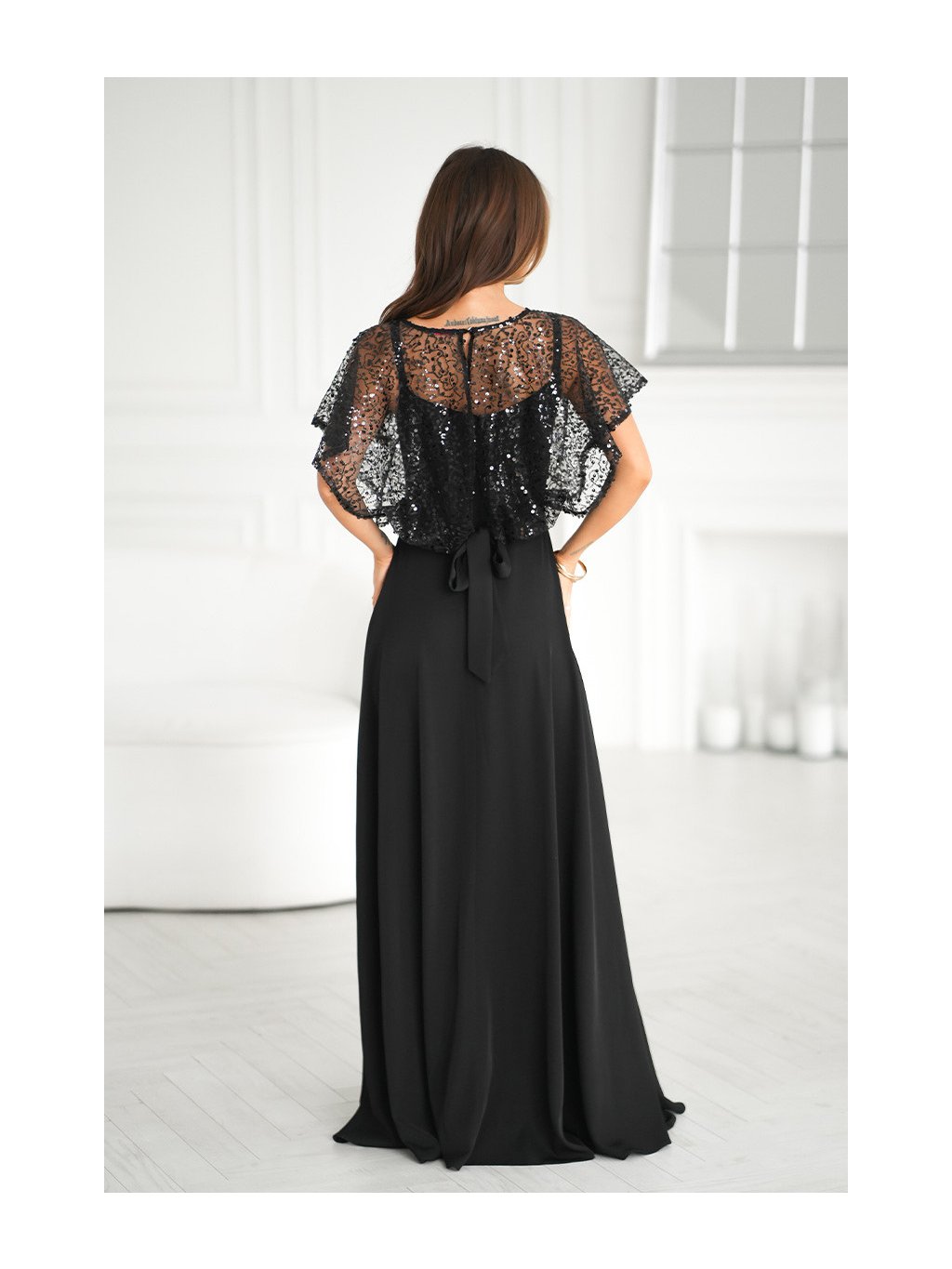 Luxusné dlhé spoločenské šaty v čiernom odtieni. Horná časť je bohato zdobená trblietavými flitrami a prekrytá jemným transparentným tylom, ktorý vytvára elegantný efekt krátkych rukávov. Viaže sa vzadu na mašľu. Okrúhly výstrih pôsobí vkusne a lichotí postave. Šaty sú v páse zvýraznené dekoratívnym kvetom. Sukňa z ľahkého materiálu dodáva šatám vzdušnosť a ženskosť, decentný rozparok zabezpečuje pohodlie pri chôdzi a zároveň pôsobí vkusne. Šaty sa zapínajú vzadu na zips.
