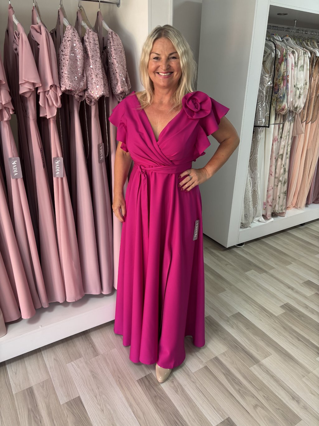 Dlhé šaty Penelopa vo fuchsiovej farbe s ružičkou