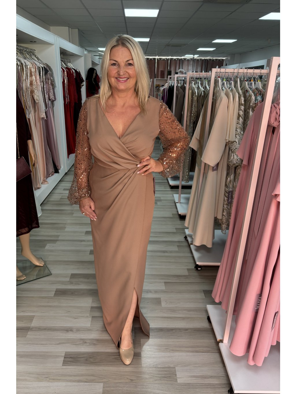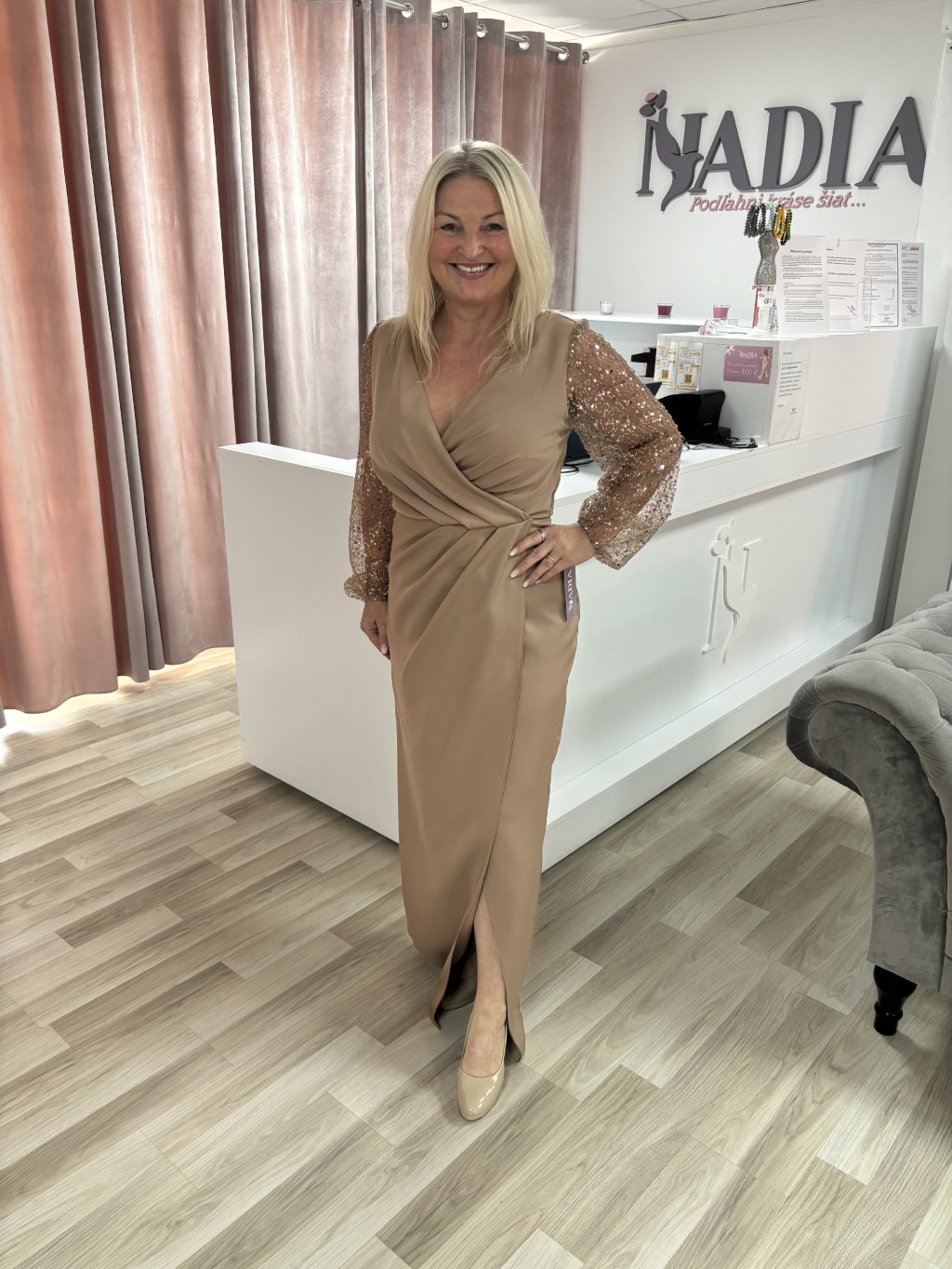 Dlhé elegantné šaty ideálne na výnimočné príležitosti. Strih s prekladaným výstrihom krásne zvýrazňuje dekolt a pás , čim opticky formuje postavu. Dlhé rukávy sú ušité s jemnej priesvitnej látky s trblietkami . Spodná časť je doplnená decentným rázporkom vpredu, vďaka ktorému pôsobia šaty elegantne a zároveň umožňujú pohodlný pohyb. Zapínanie na zips.