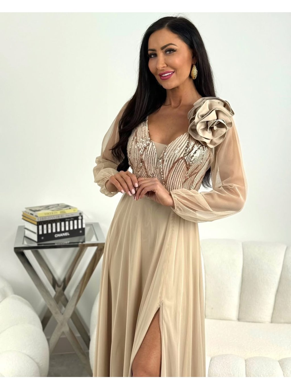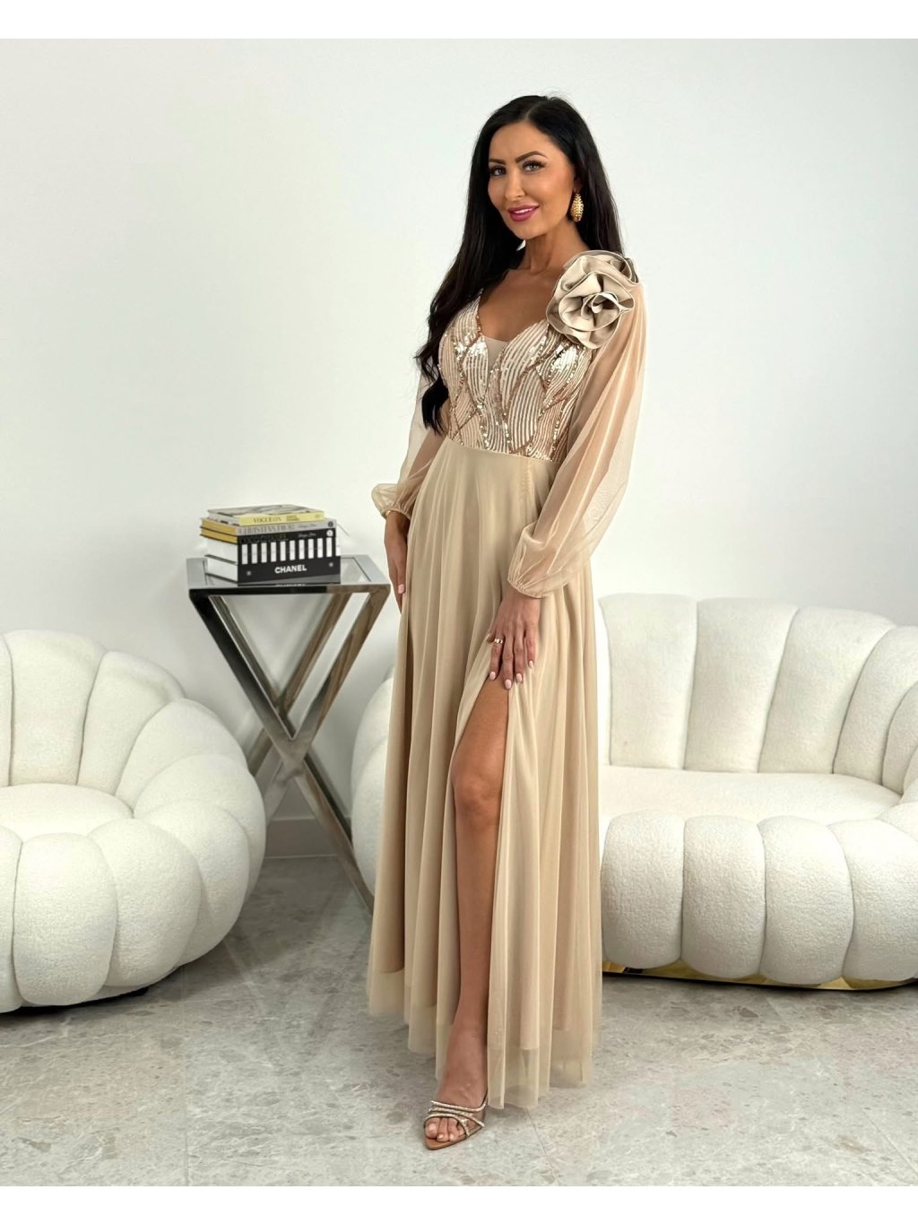 Dlhé šaty so sieťkovanými rukávmi, flitrami a ružou v béžovej farbe