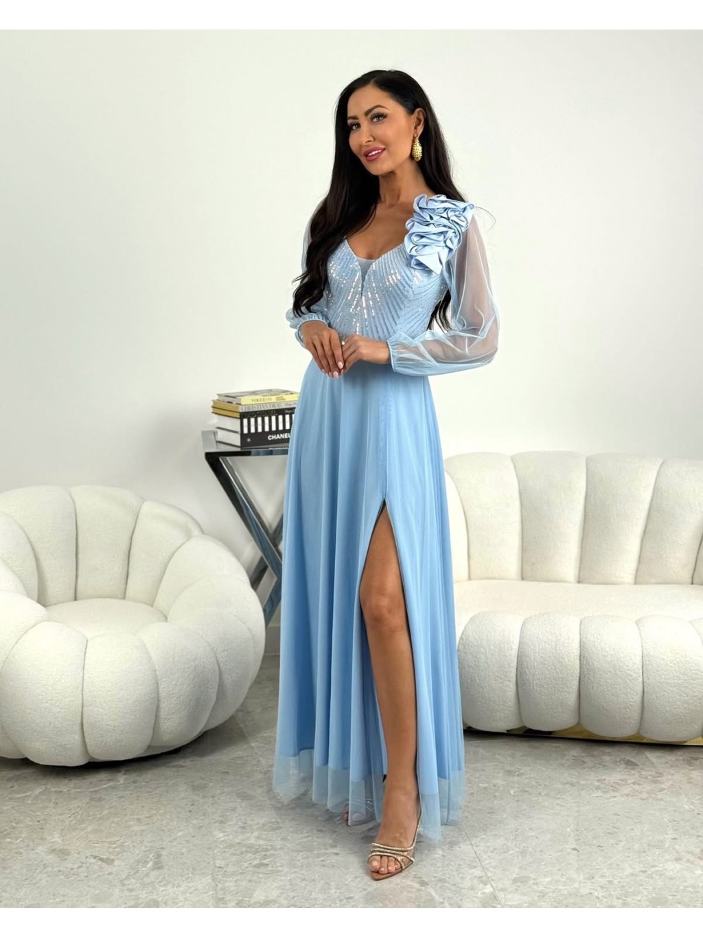 Dlhé šaty so sieťkovanými rukávmi, flitrami a ružou v svetlomodrej farbe