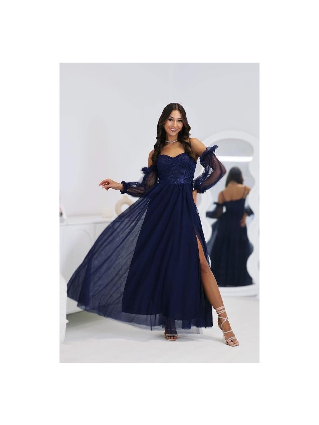 Dlhé tmavomodré korzetové šaty s puff rukávmi