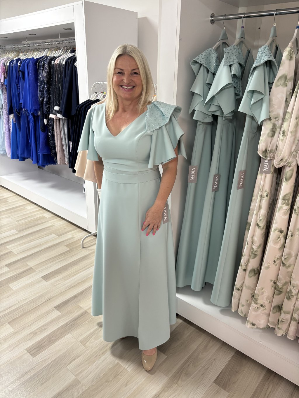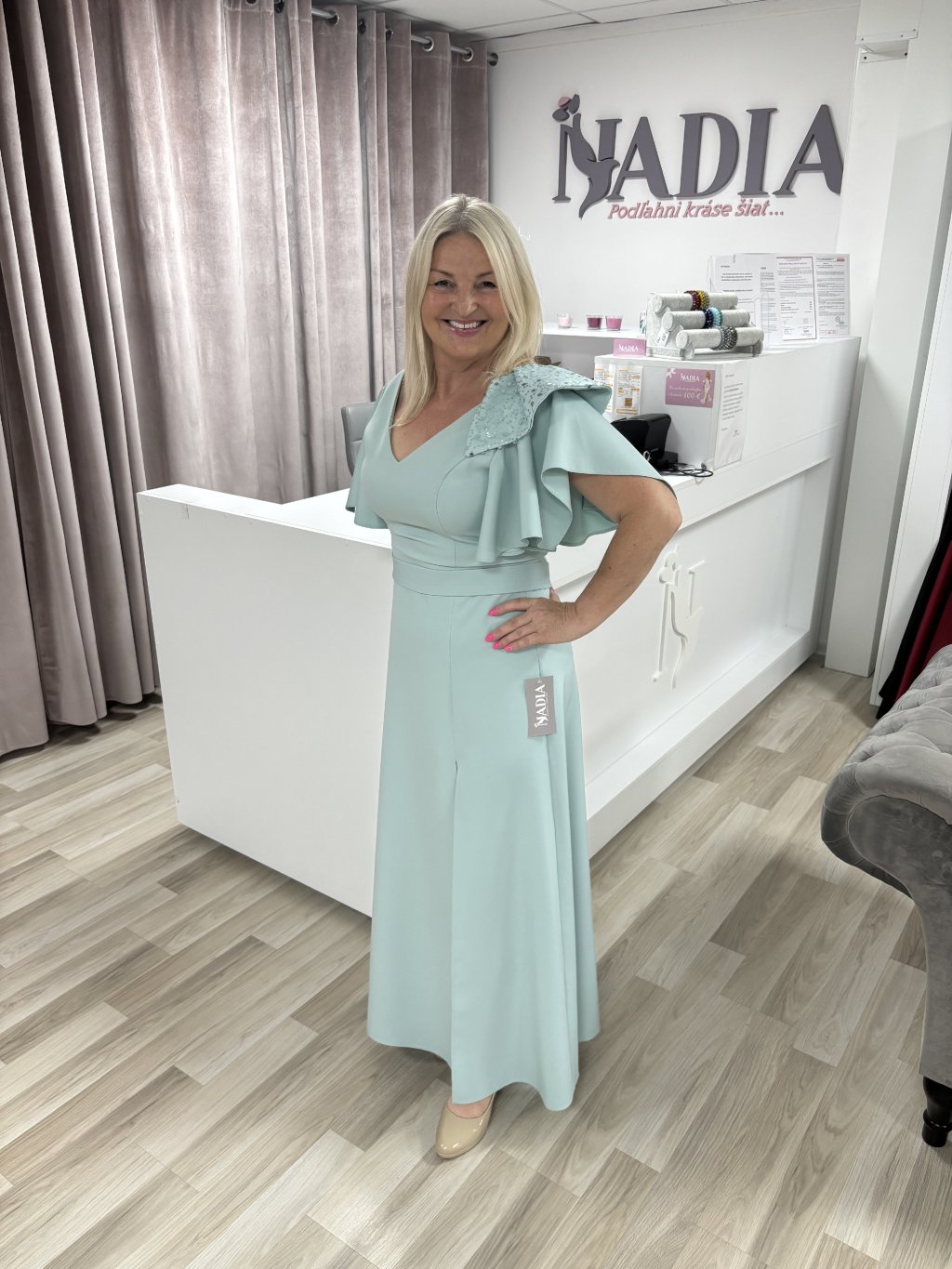 Elegantné dlhé šaty očaria vzdušným strihom. Sukňa voľného strihu do "A" umožňuje pohodlný pohyb s možnosťou uviazať opasok .Krátke, volánové padajúce rukávy s flitrami dodávajú šatám vzdušnosť a eleganciu. Na jednom ramene je umiestnená látková dekorácia. Výstrih do tvaru "V" opticky zoštíhľuje a zvýrazňuje dekolt. Šaty sa zapínajú vzadu na zips.