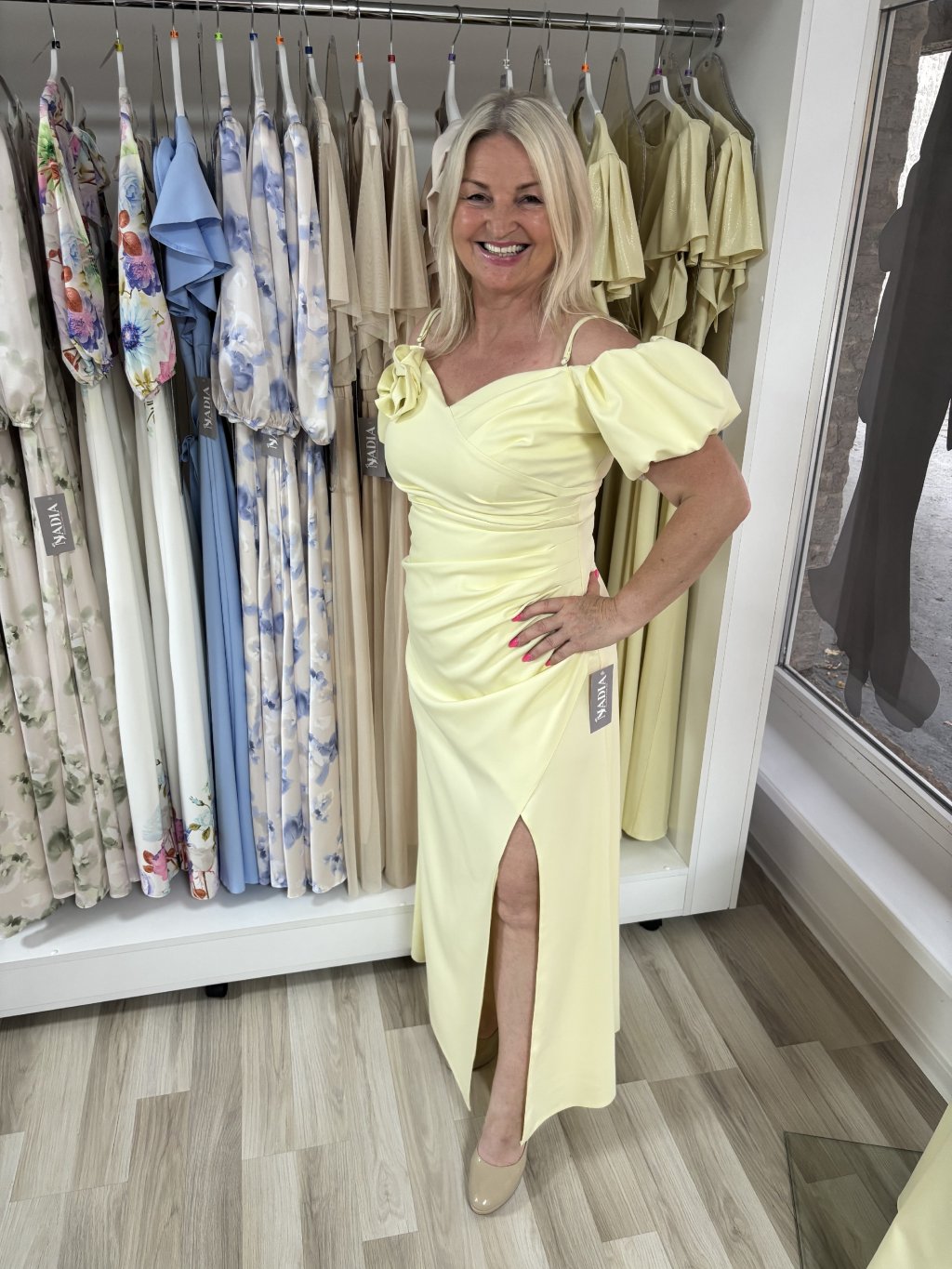Horná časť šiat je nariasená, pôsobí zvodne no zároveň vkusne. Tenké nastaviteľné ramienka poskytujú pohodlné nosenie a umožňujú prispôsobiť šaty postave a padnuté rukávy im dodávajú elegantný efekt. Riasenie na boku zvýrazňuje pás a zakrýva nedokonalosti. Látková ruža na ramene pôsobí romanticky. Jemný rázporok umožňuje pohodlný pohyb. Šaty sa zapínajú vzadu na zips.