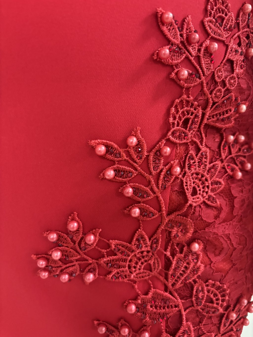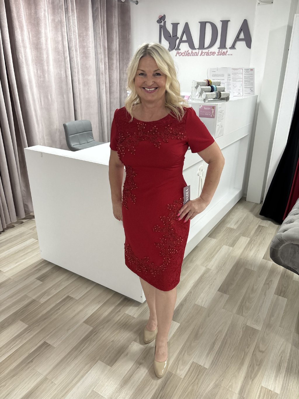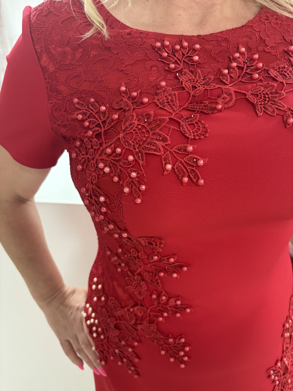 Elegantné červené šaty rovného strihu s krátkym rukávom a 3D krajkou dozdobené perličkami. Šaty sa zapínajú vzadu na zips.