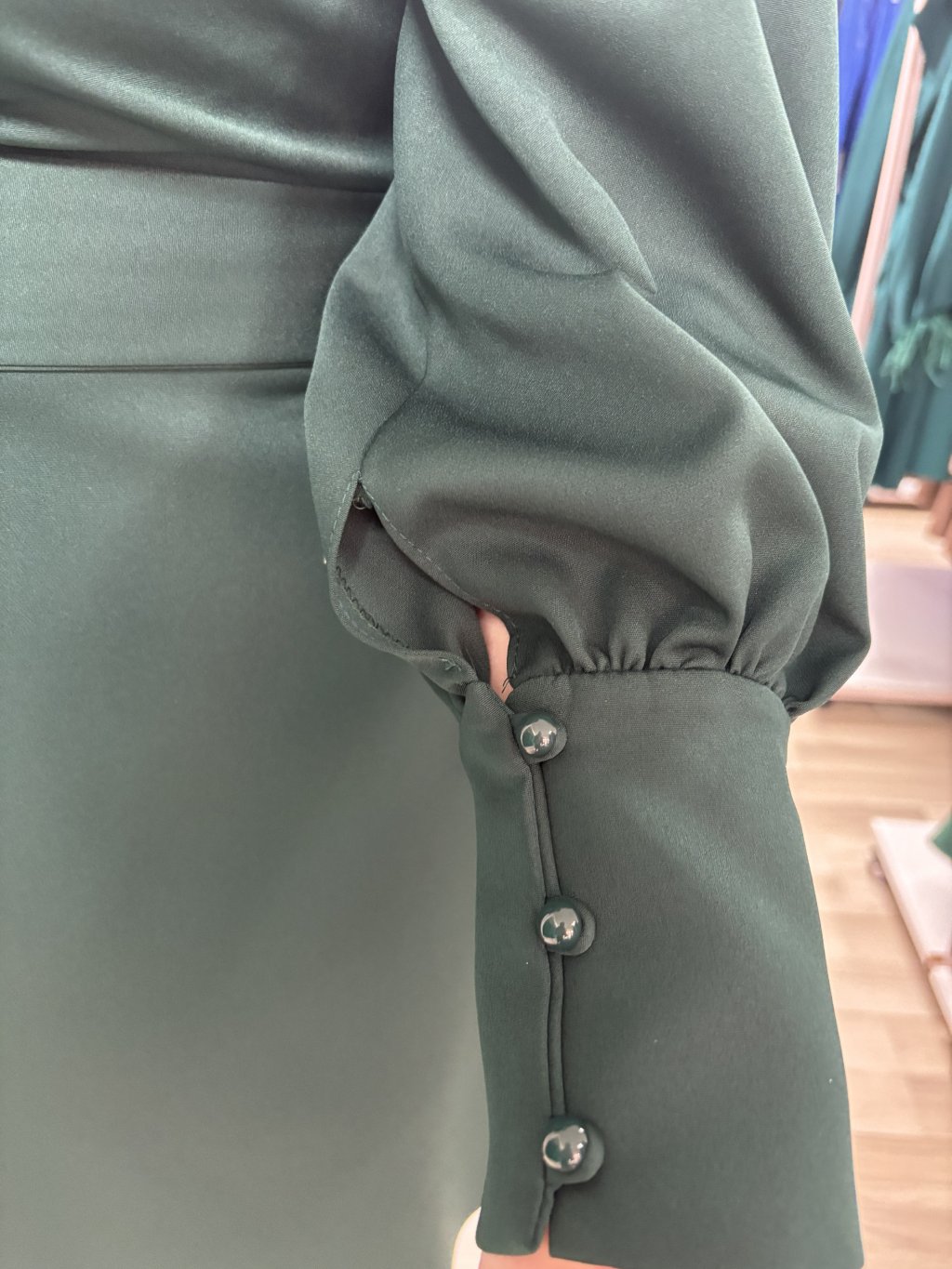 Elegantné krátke šaty s dlhým rukávom a miernym nariasením na ramenách . Výstrih do tvaru V opticky predlžuje krk a pôsobí veľmi lichotivo. Sukňa mierne do "A" siahajúca po kolená alebo tesne nad kolená. V páse je možné uviazať si opasok. Šaty sa zapínajú vzadu na zips.