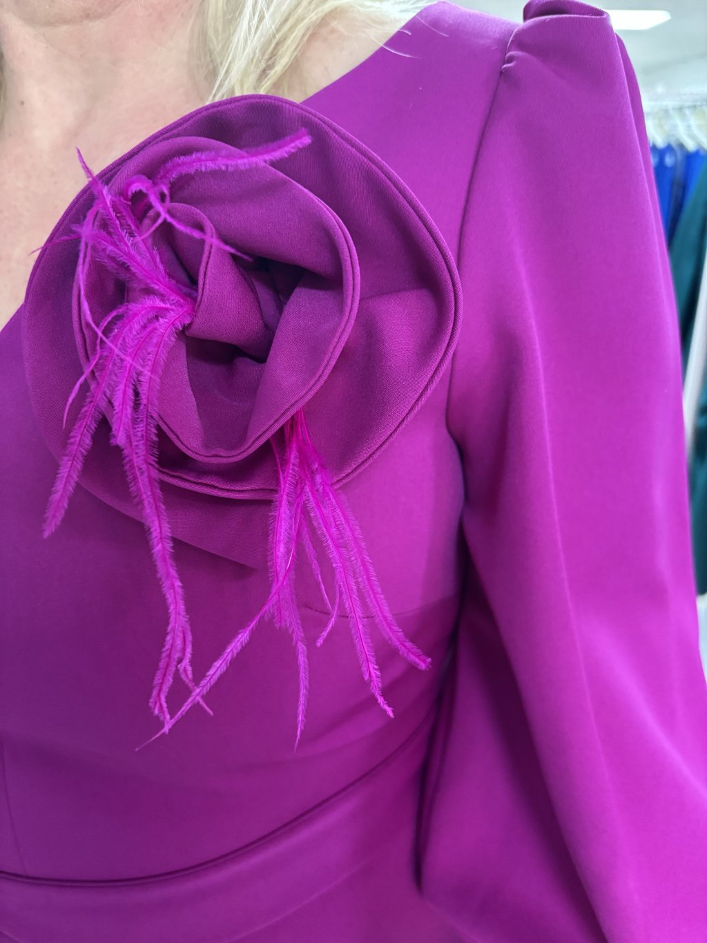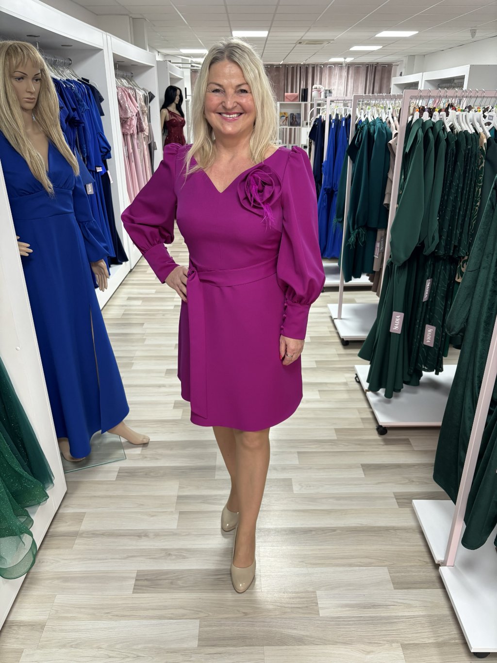 Krátke Flora šaty s ružou do "A" vo fuchsiovej farbe