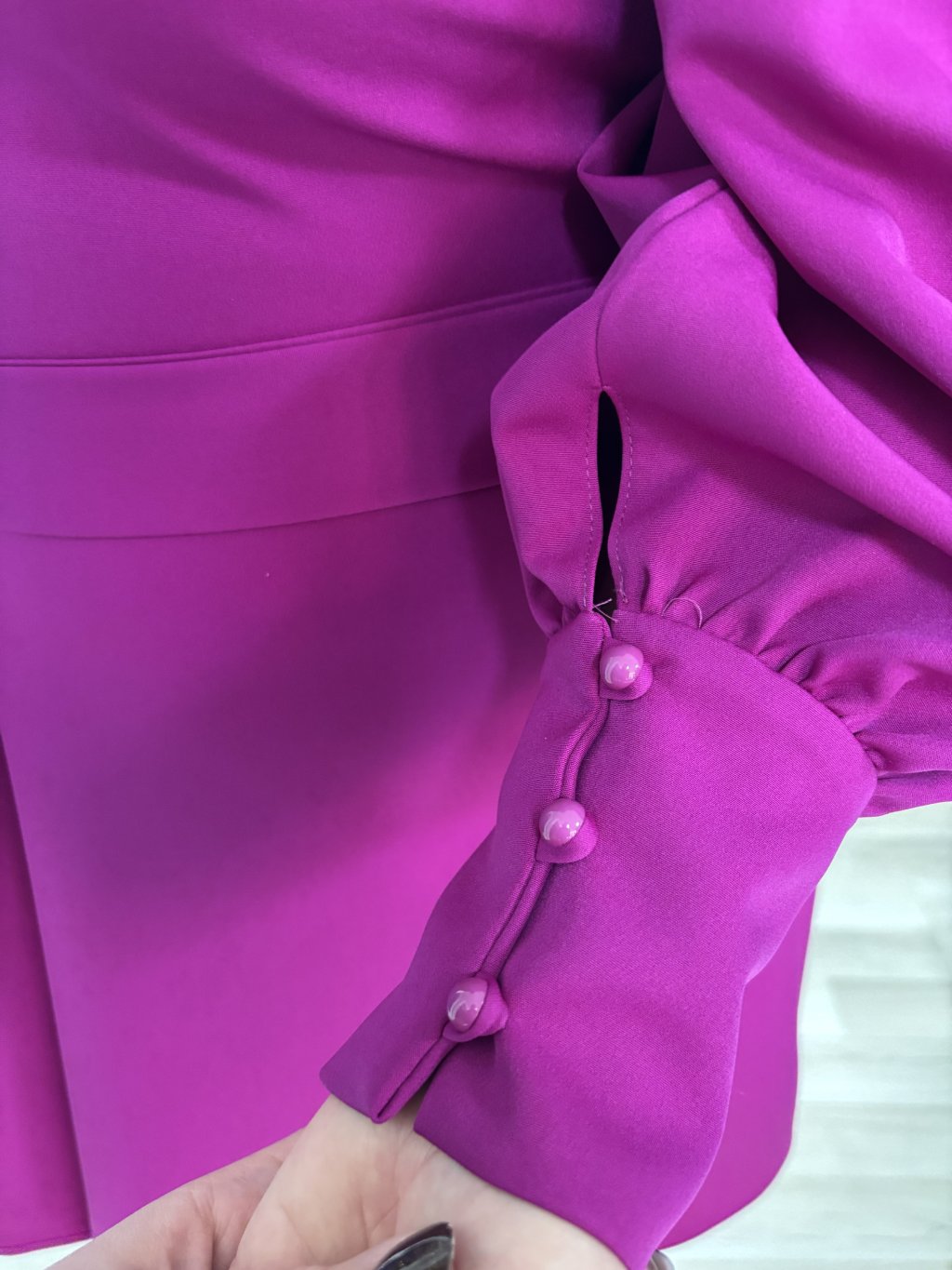 Elegantné krátke šaty s dlhým rukávom a miernym nariasením na ramenách . Výstrih do tvaru V opticky predlžuje krk a pôsobí veľmi lichotivo. Sukňa mierne do "A" siahajúca po kolená alebo tesne nad kolená. V páse je možné uviazať si opasok. Šaty sa zapínajú vzadu na zips.
