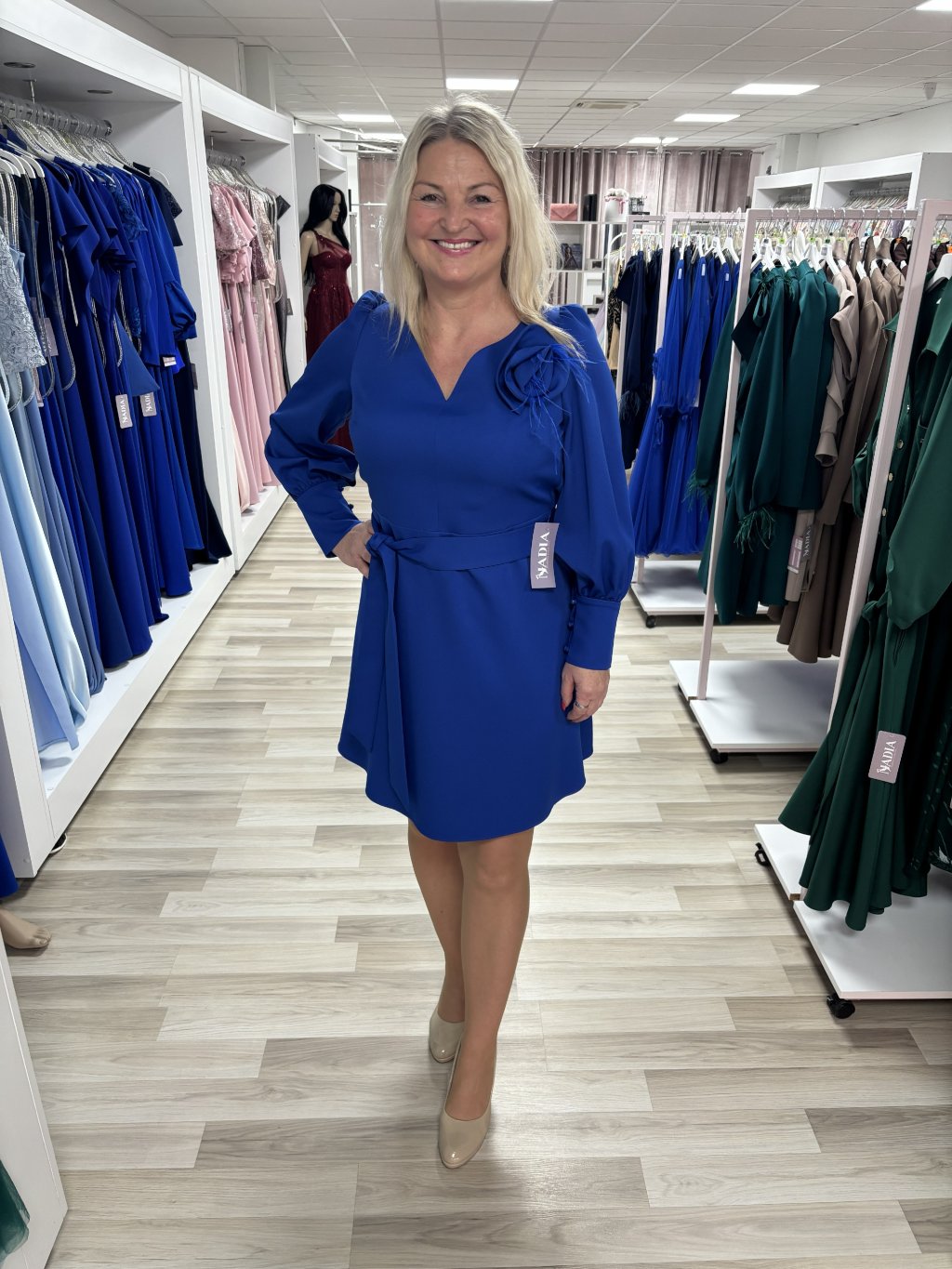 Elegantné krátke šaty s dlhým rukávom a miernym nariasením na ramenách . Výstrih do tvaru V opticky predlžuje krk a pôsobí veľmi lichotivo. Sukňa mierne do "A" siahajúca po kolená s opaskom.