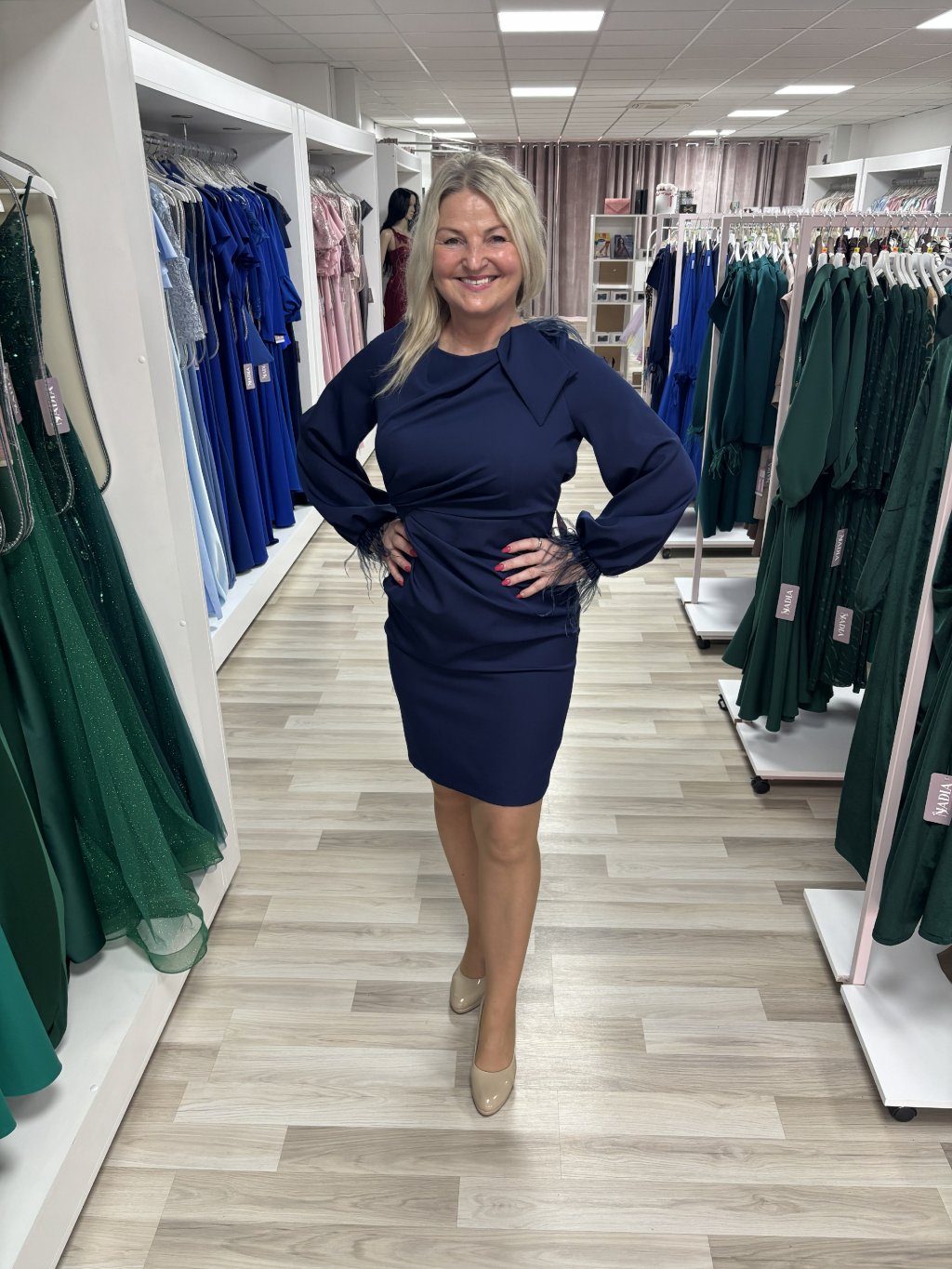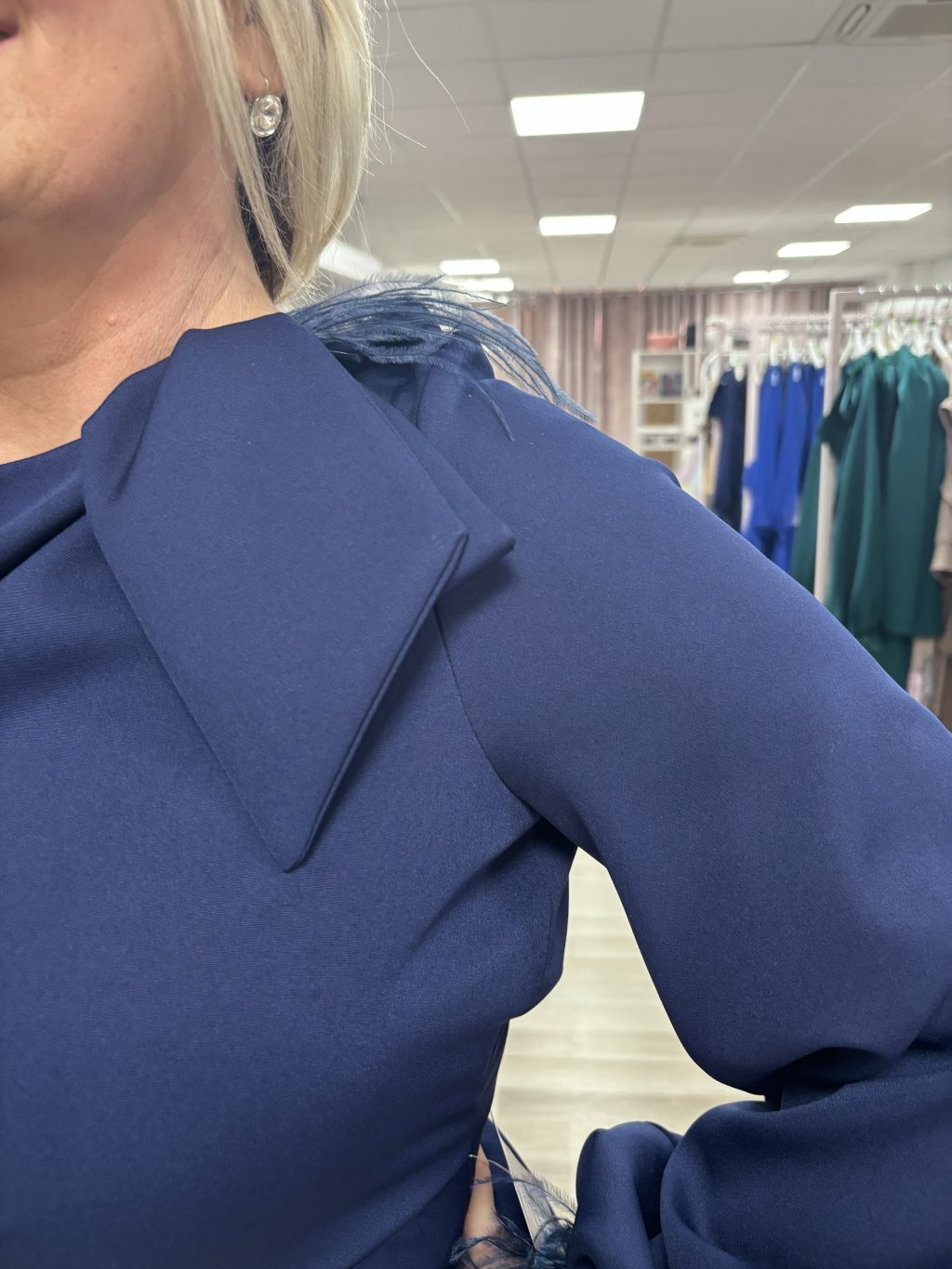 Šaty majú mierne priliehavý strih, asymetrické riasenie v prednej časti, pôsobí veľmi lichotivo, dekoratívna mašľa na ramene. Dlhé a jemne rozšírené rukávy ukončené zapínaním na gombík a ozdobnými pierkami. Šaty sa zapínajú vzadu na zips.