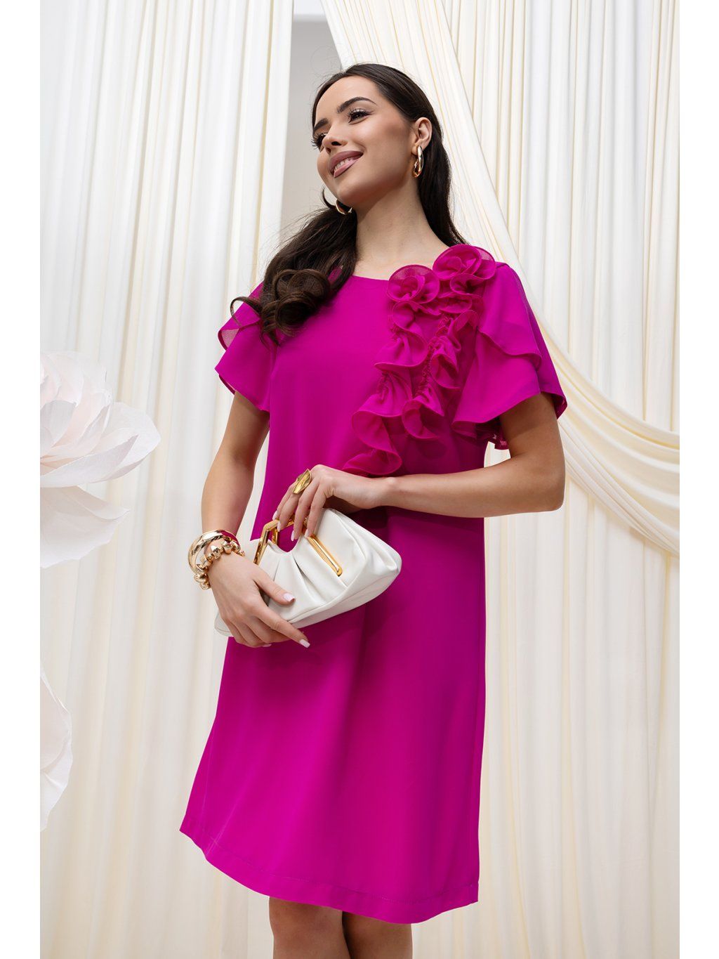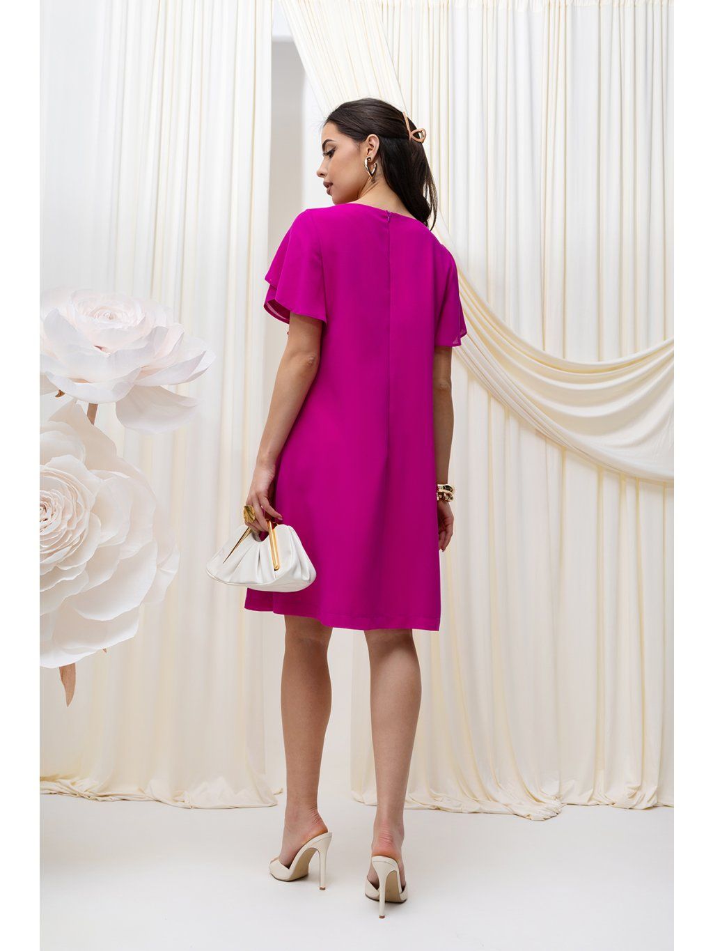 Elegantné krátke šaty mierne áčkoveho strihu pôsobia elegantne a žensky. Rukávy sú široké, voľné z ľahkého materiálu, čo vytvára ľahký a vzdušný efekt. Kvietkovaná aplikácia na jednej strane ramena . Šaty sa zapínajú vzadu na zips.
