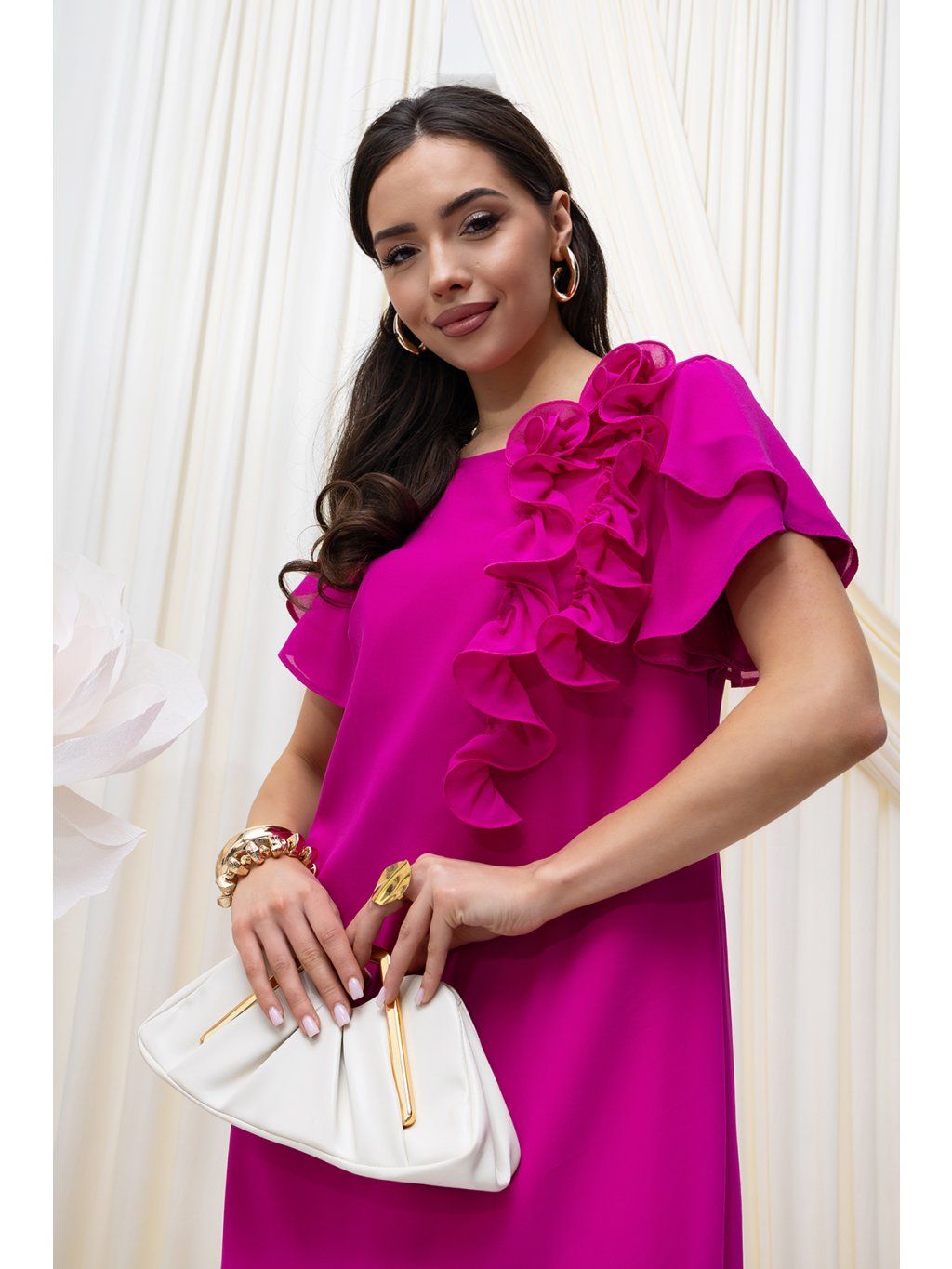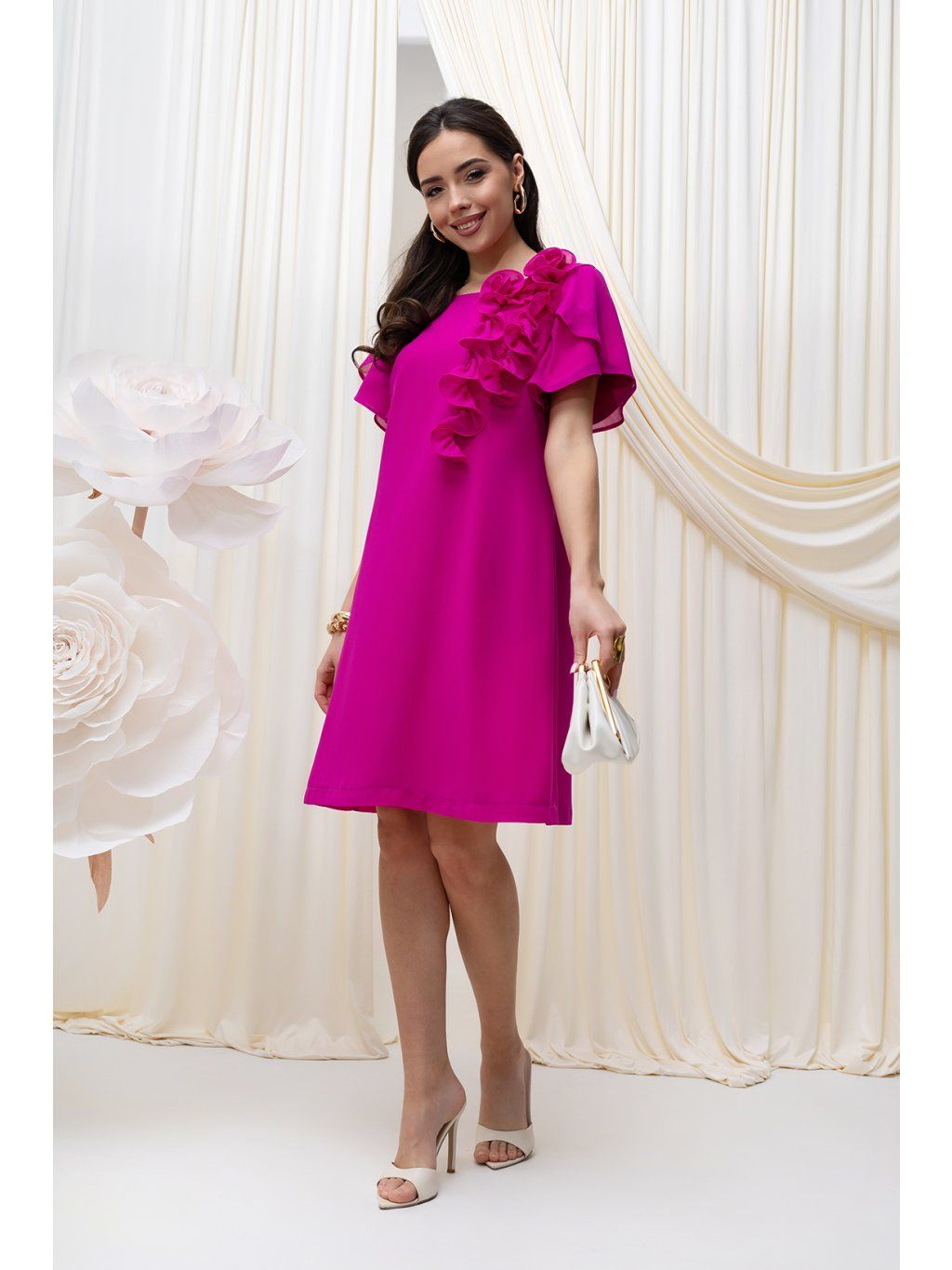 Krátke šaty Karmen vo fuchsiovej farbe s kvietkovanou aplikáciou