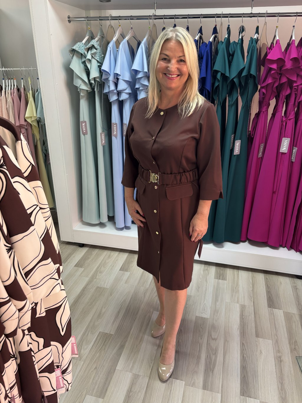 Krátke hnedé šaty so zlatými gombíkmi a opaskom