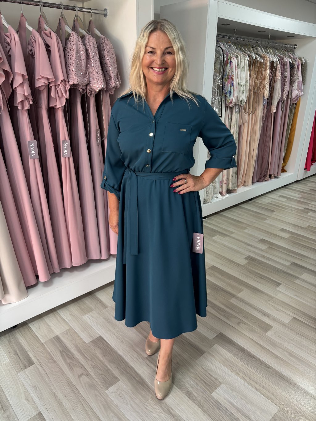 Midi košeľové šaty s opaskom v petrolejovej farbe