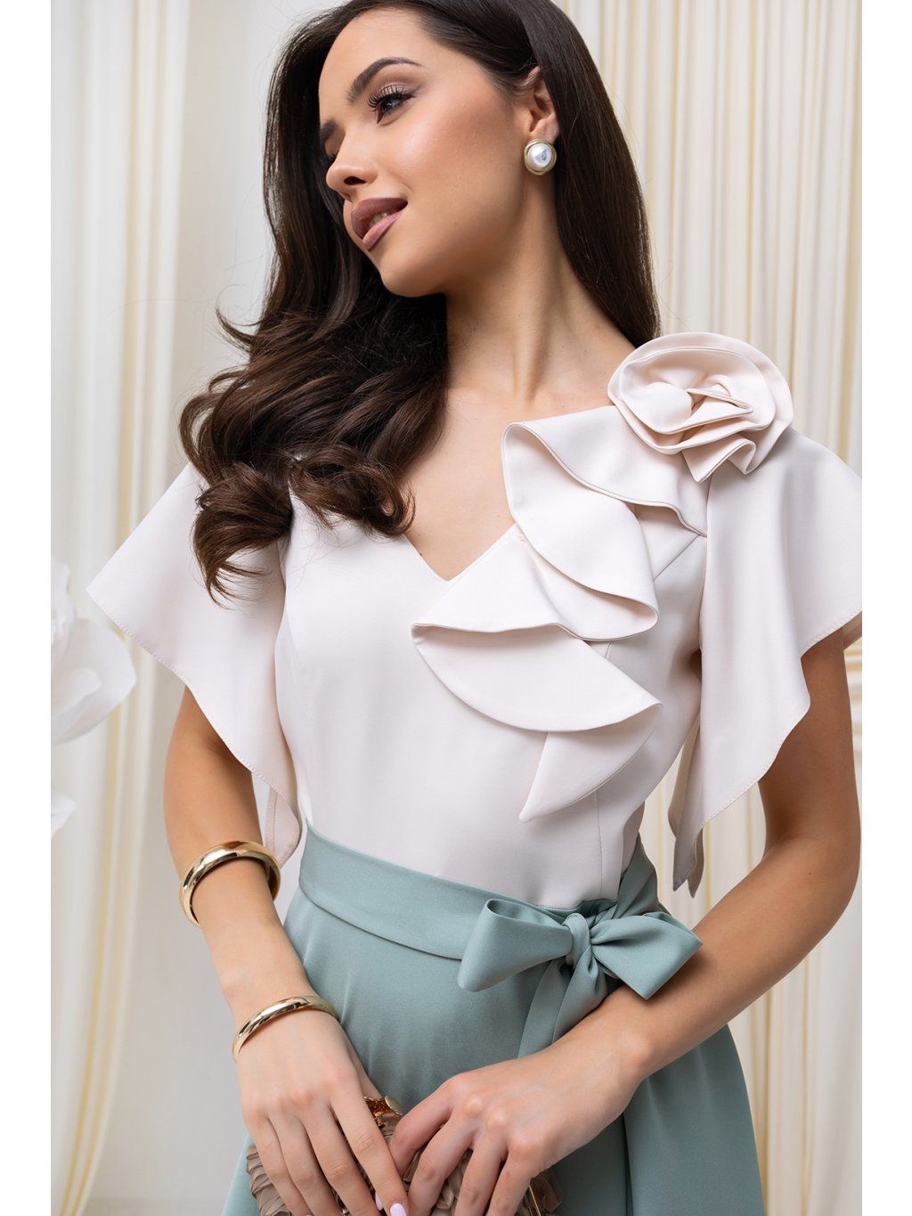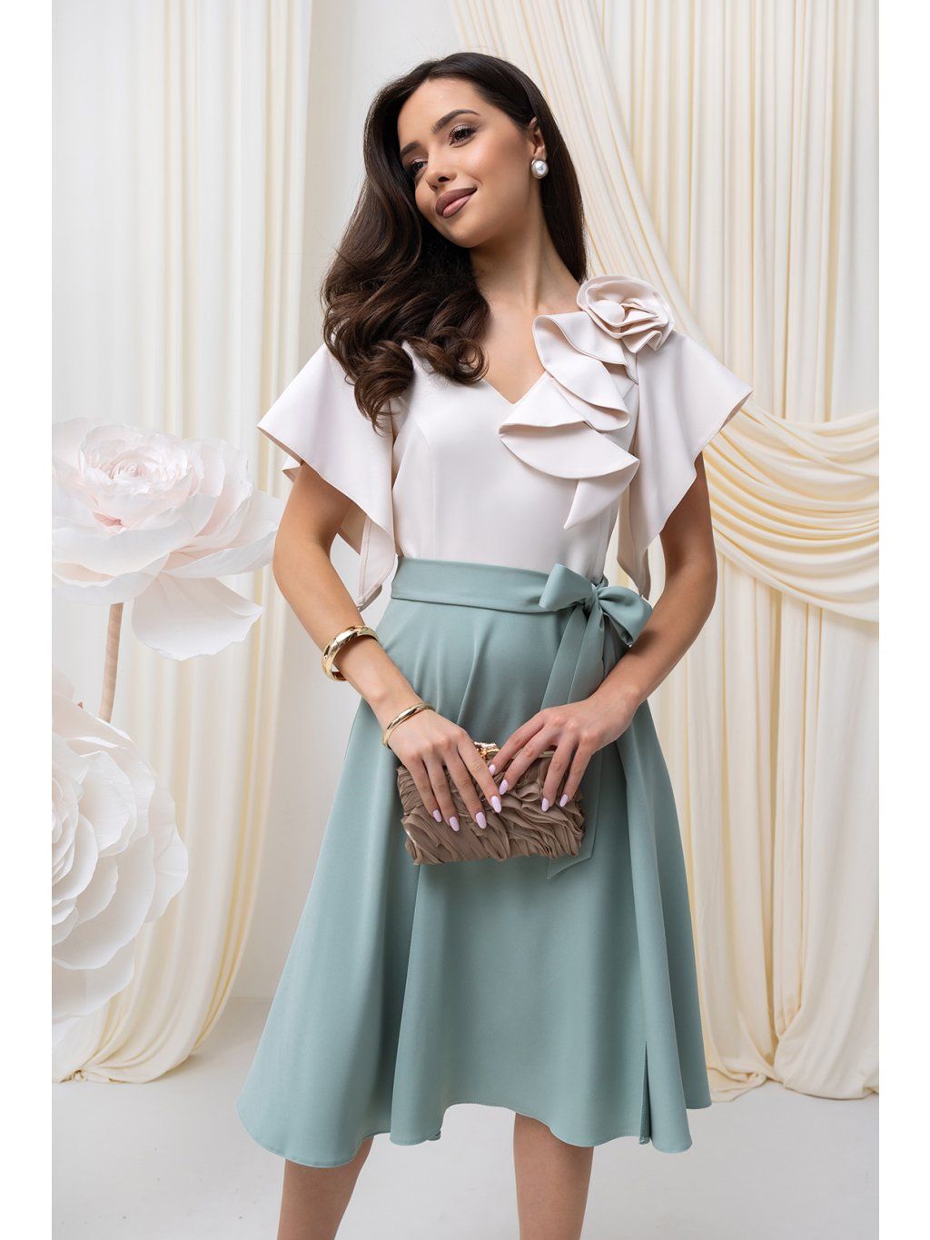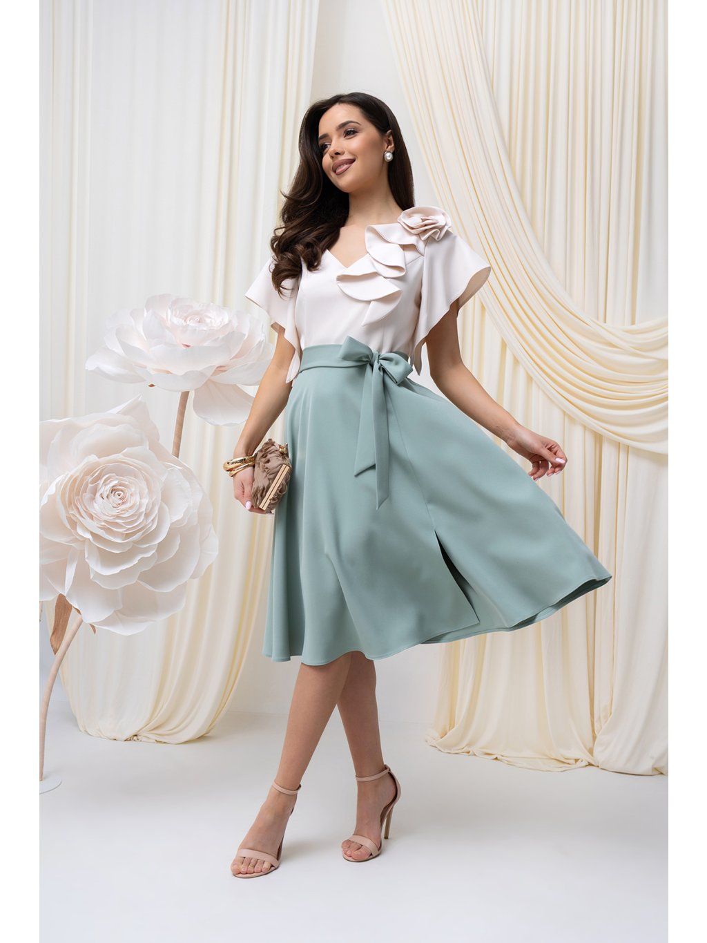 Elegantné midi šaty očaria vzdušným strihom. Sukňa voľného strihu do "A" umožňuje pohodlný pohyb s možnosťou uviazať opasok .Krátke, voľné padajúce rukávy s jemným riasením dodávajú šatám vzdušnosť a eleganciu. Na jednom ramene je umiestnená látková dekorácia v dobe ruže. Šaty sa zapínajú vzadu na zips.
