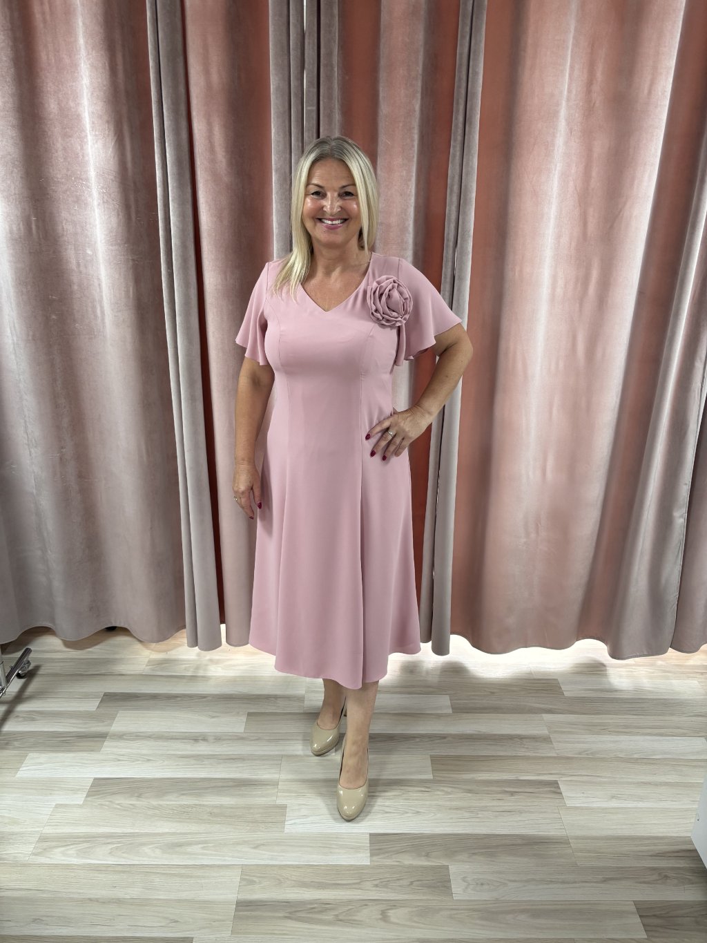 Midi ružové šaty do "A" s ružou a krátkym rukávčekom