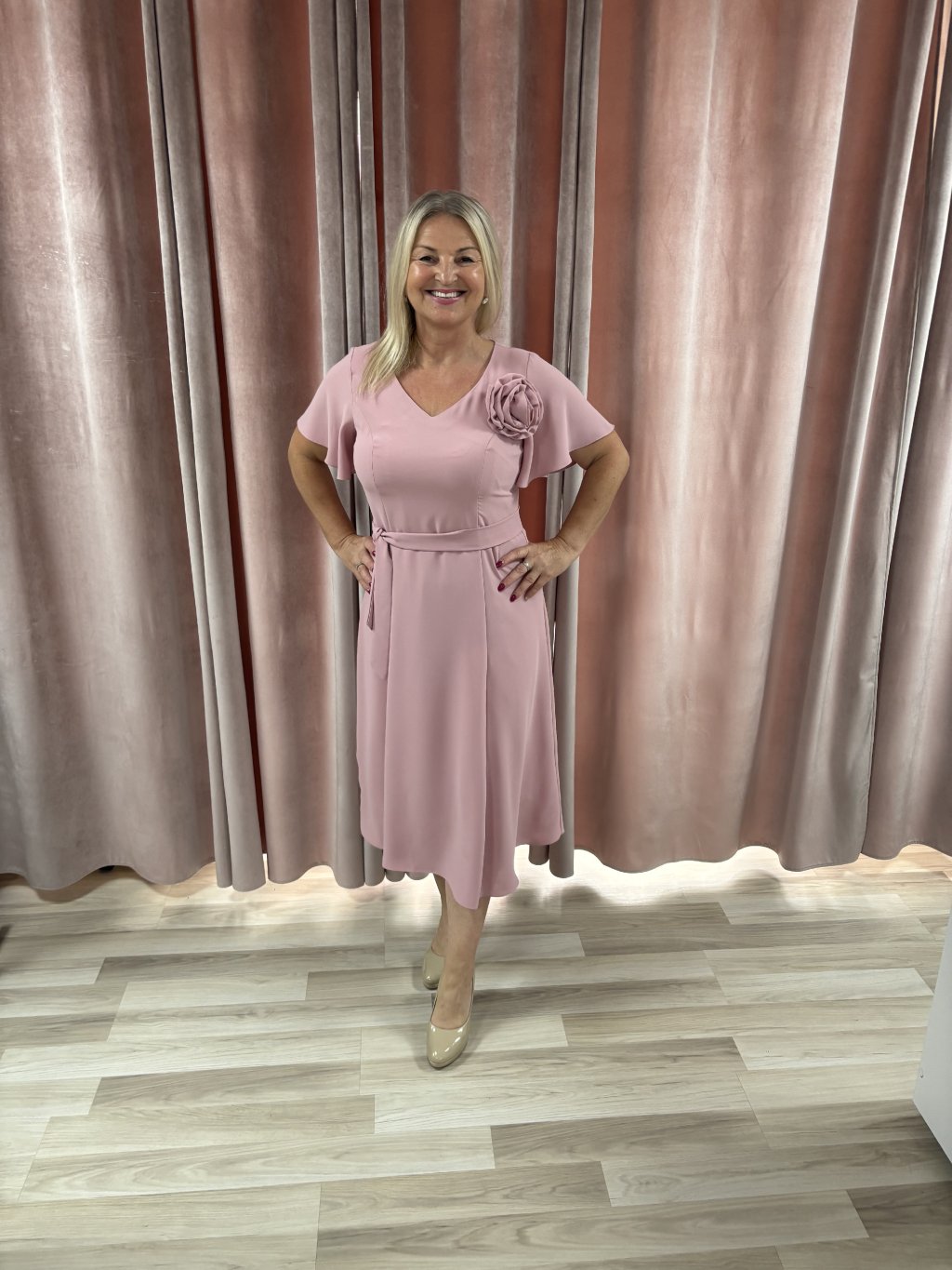 Šaty sa zapínajú vzadu na zips , v páse je opasok, ktorý sa viaže na mašľu alebo uzol. Sukňa je rozšírená do mierneho áčka, čo vytvára ženskú siluetu. Jemný krátky rukáv dodáva šatám elegantný nádych . Výstrih do tvaru V opticky predlžuje krk a pôsobí veľmi lichotivo. Látková ozdoba v tvare kvetu je na magnet, teda je možné ju umiestniť kdekoľvek.