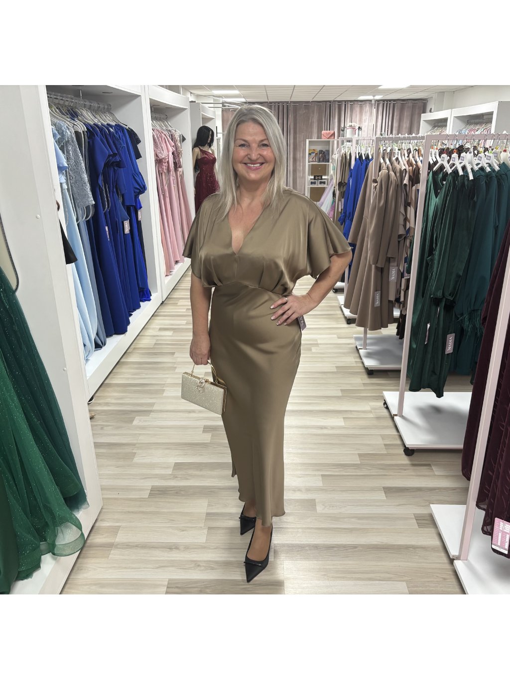 Midi šaty siahajú približne po lýtka s mierne priliehavým strihom, ktorý pekne zvýrazňuje postavu. Výstrih do tvaru V pôsobí predlžujúco a opticky zoštíhľuje. Rukávy sú krátke až po lakte , voľnejšie a mierne spadnuté, dodávajú šatám jemný, romantický vzhľad. Šaty sú prešívané pod prsiami s jemným riasením čo pekne tvaruje siluetu a vytvára ženský efekt. Na zadnej strane šiat je zips.