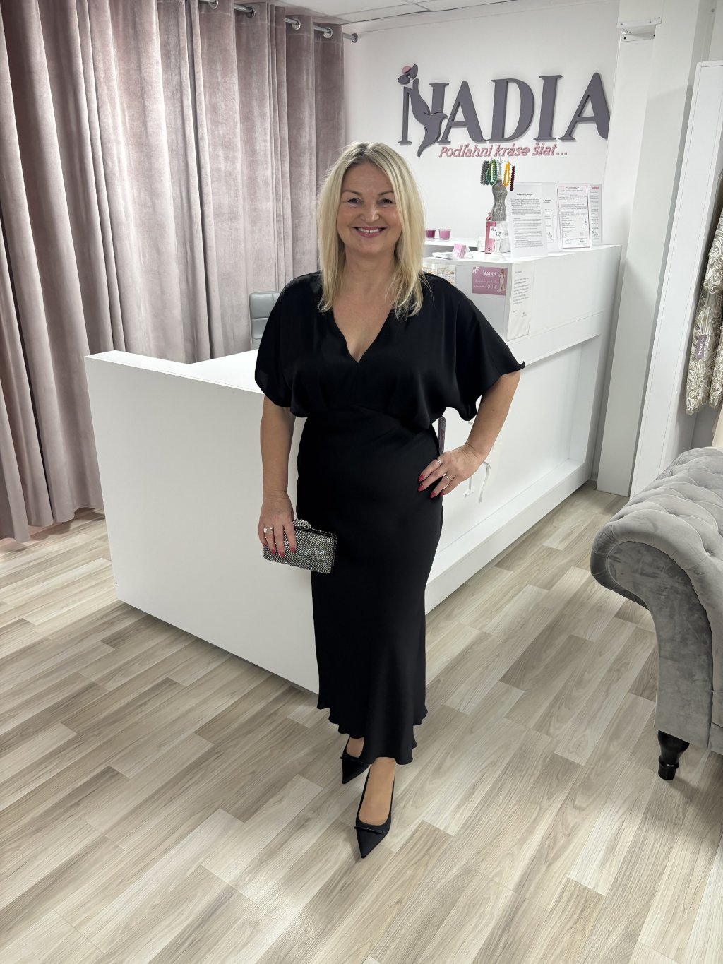 Midi saténové šaty s krátkym rukávčekom v čiernej farbe