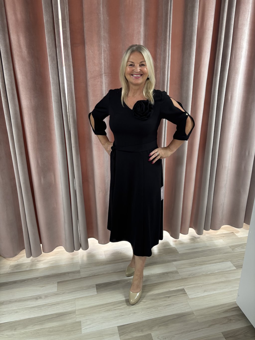 Midi šaty do "A" s ružou a dlhším rukávčekom v čiernej farbe