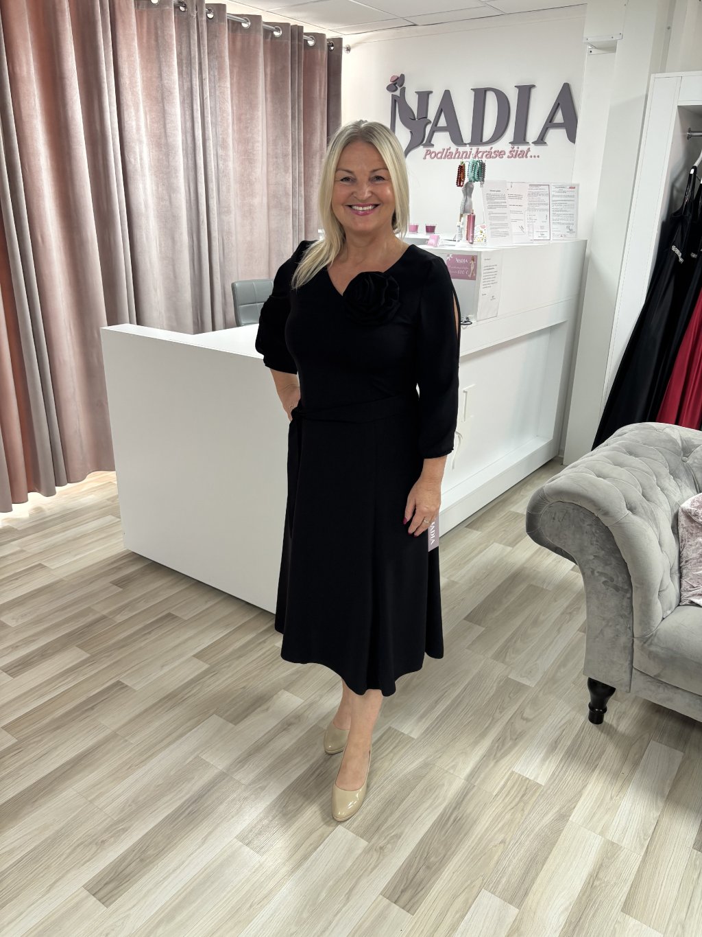 Šaty sa zapínajú vzadu na zips , v páse je opasok, ktorý sa viaže na mašľu alebo uzol. Sukňa je rozšírená do mierneho áčka, čo vytvára ženskú siluetu. Otvorený 3/4 rukáv dodáva šatám elegantný nádych . Výstrih do tvaru V opticky predlžuje krk a pôsobí veľmi lichotivo. Látková ozdoba v tvare kvetu je na magnet, teda viete si ju umiestniť kdekoľvek.