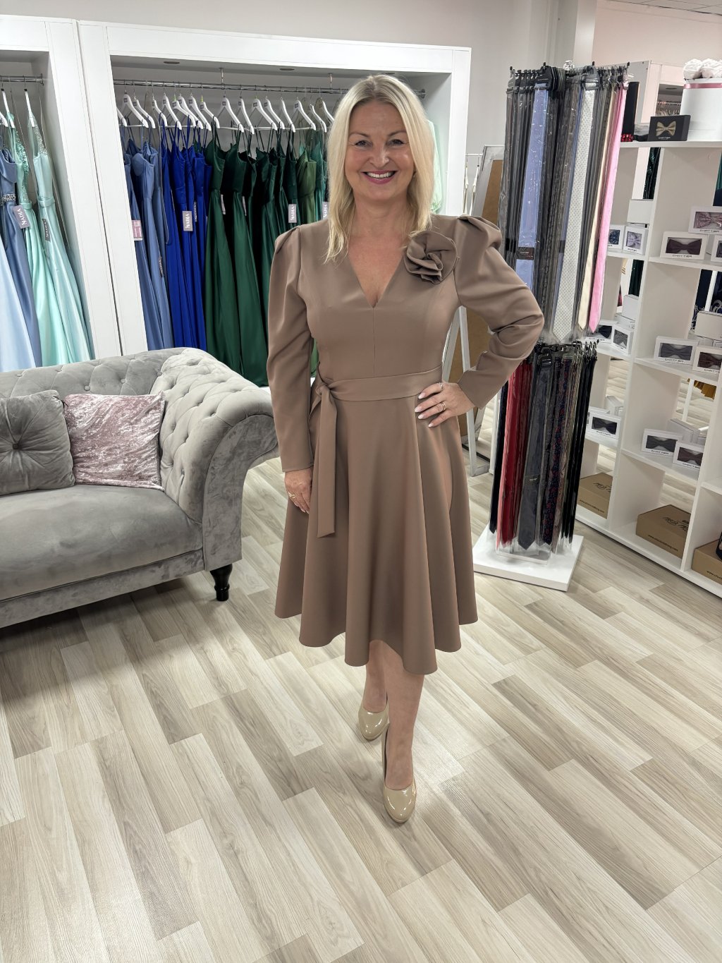 Šaty sa zapínajú vzadu na zips , v páse je opasok, ktorý sa viaže na mašľu alebo uzol. Sukňa je rozšírená do mierneho áčka, čo vytvára ženskú siluetu. Dlhý rukáv s nariasením na ramenách dodáva šatám elegantný nádych . Výstrih do tvaru V opticky predlžuje krk a pôsobí veľmi lichotivo.