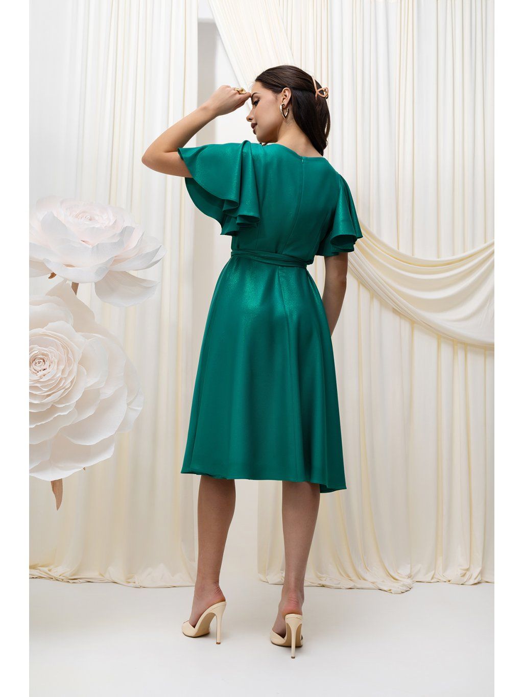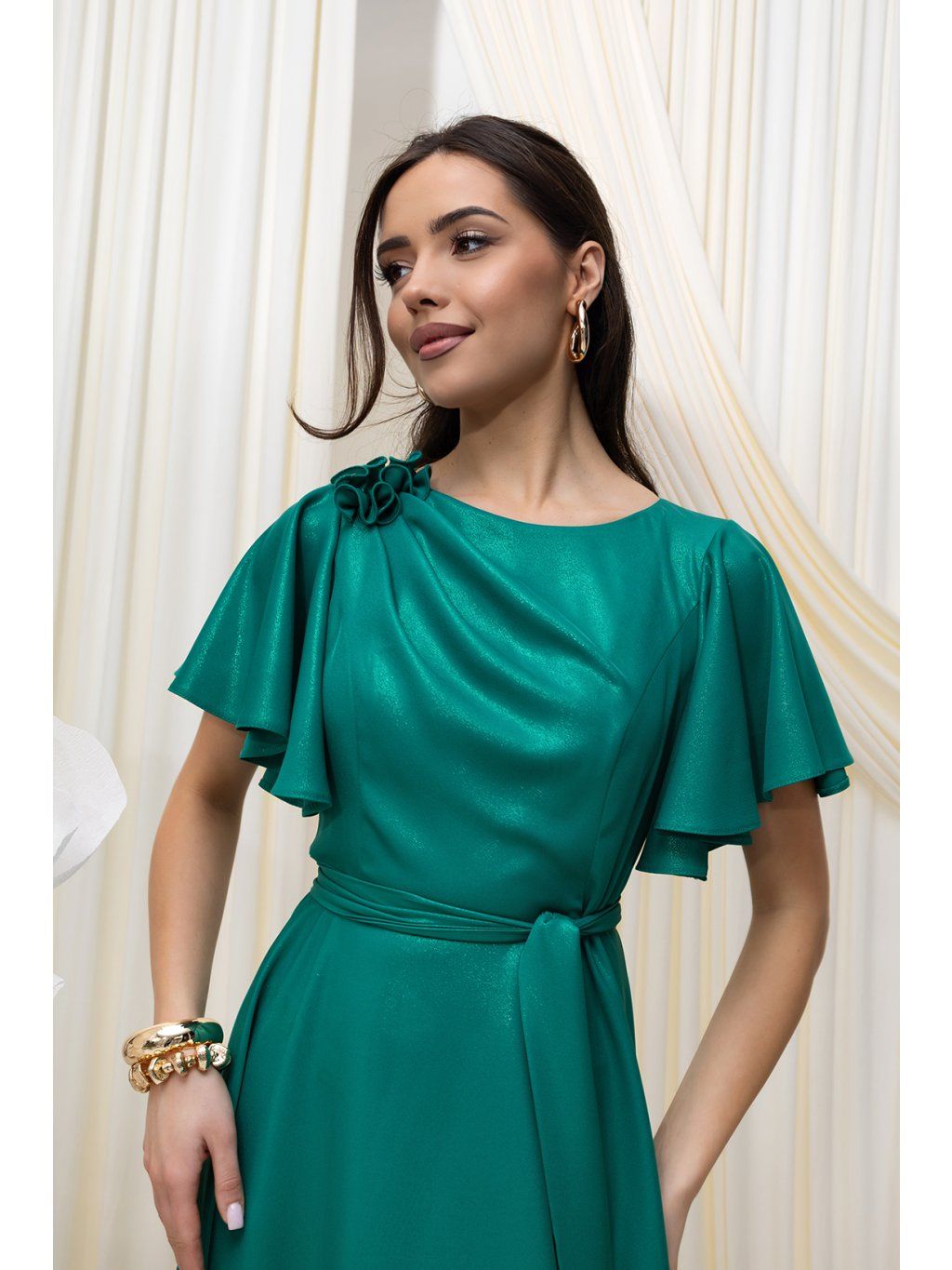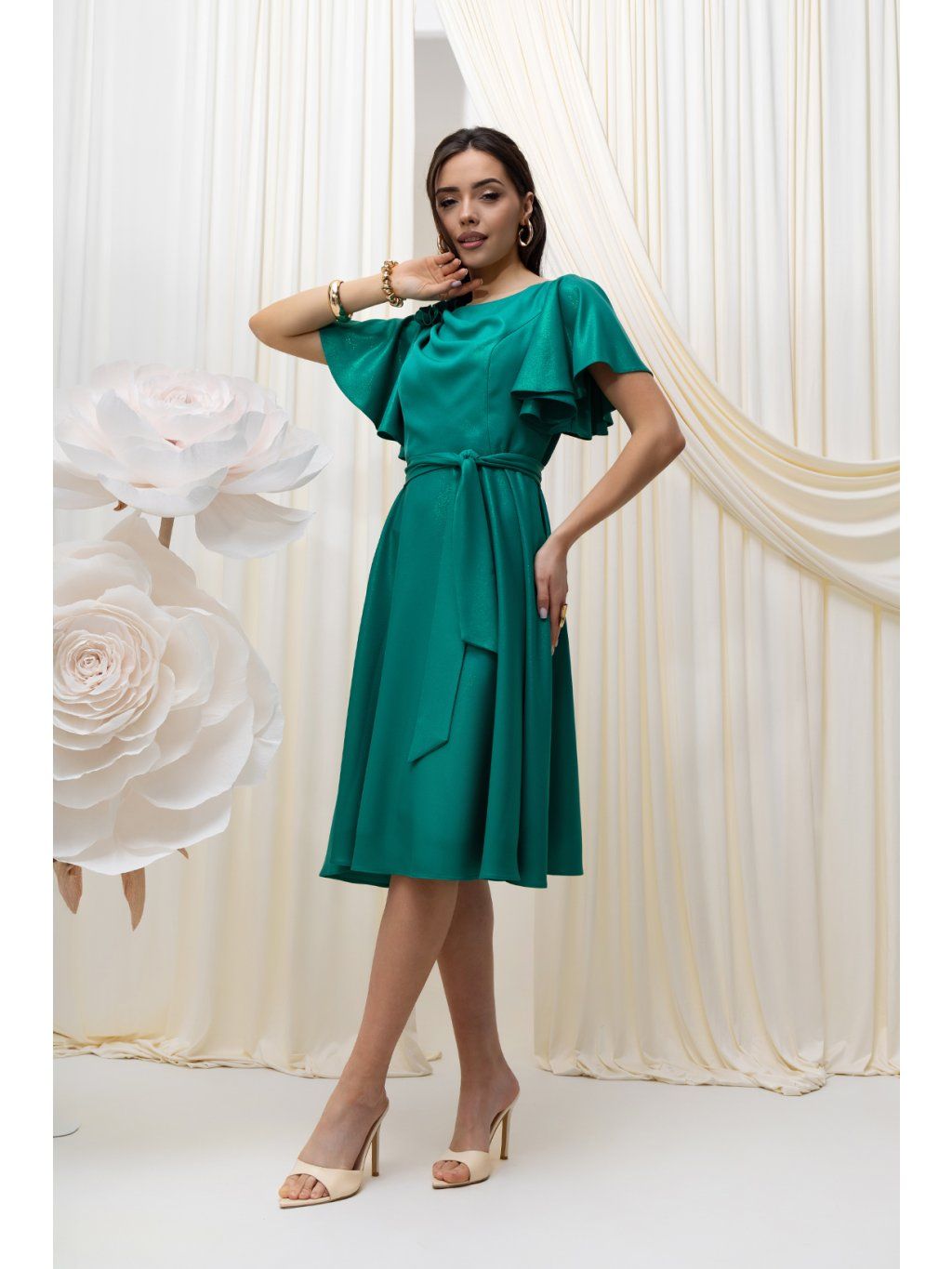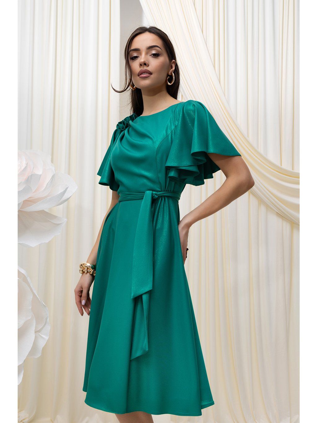 Elegantné midi šaty očaria vzdušným strihom. Šaty sú ušité z lesklej látky. Sukňa voľného strihu do "A" umožňuje pohodlný pohyb s možnosťou uviazať opasok .Krátke, voľné padajúce rukávy s jemným riasením dodávajú šatám vzdušnosť a eleganciu. Na jednom ramene je umiestnená látková dekorácia v tvare ruže. Šaty sa zapínajú vzadu na zips.