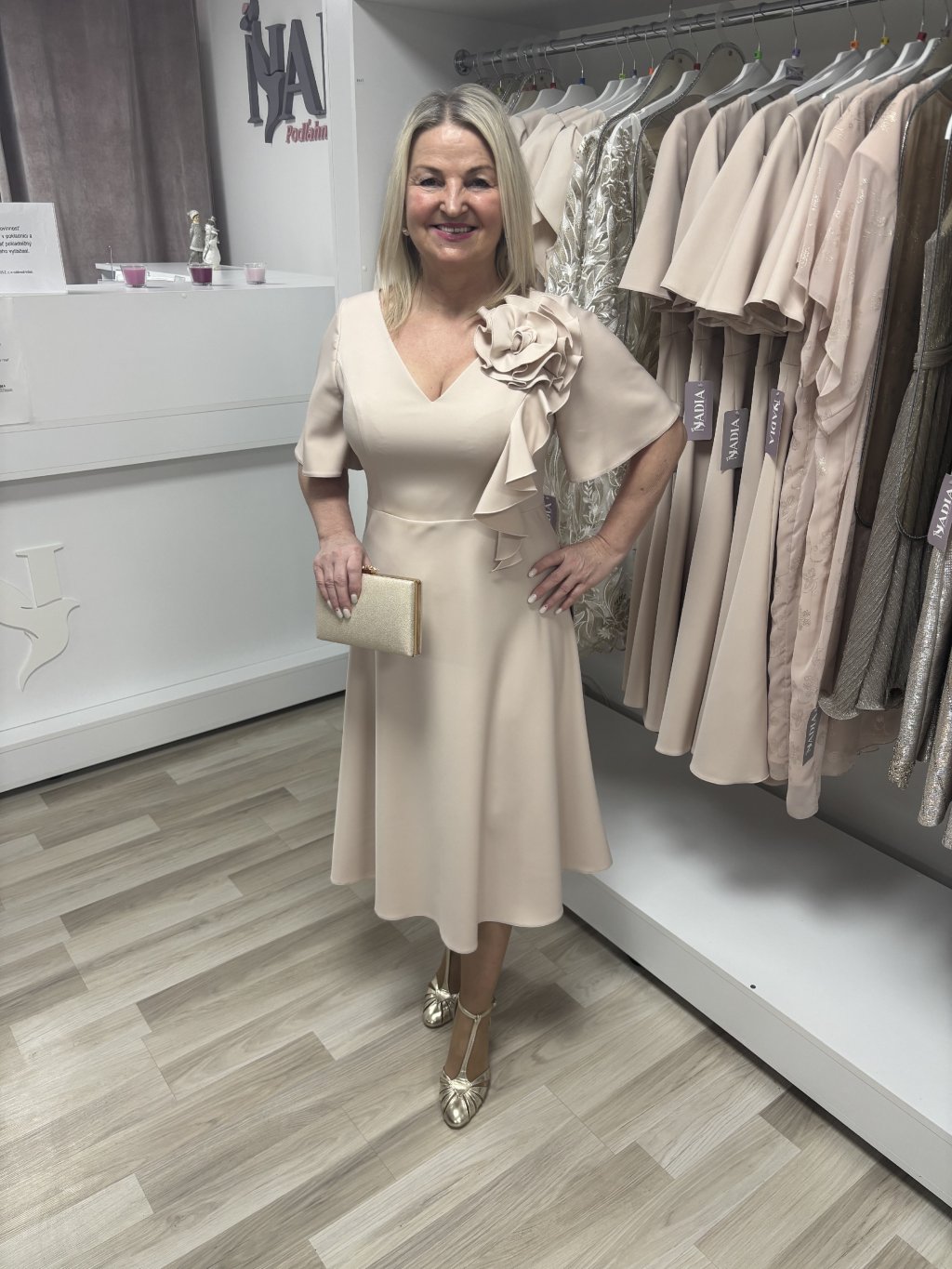 Midi šaty Ramona v béžovej farbe s ružou